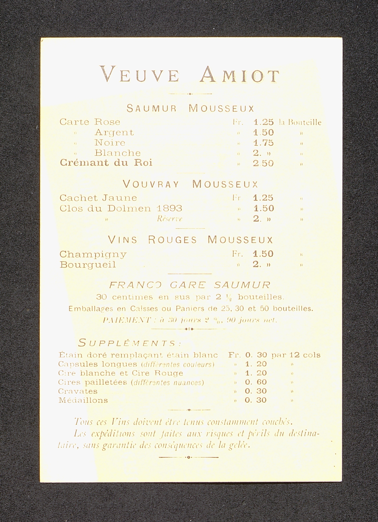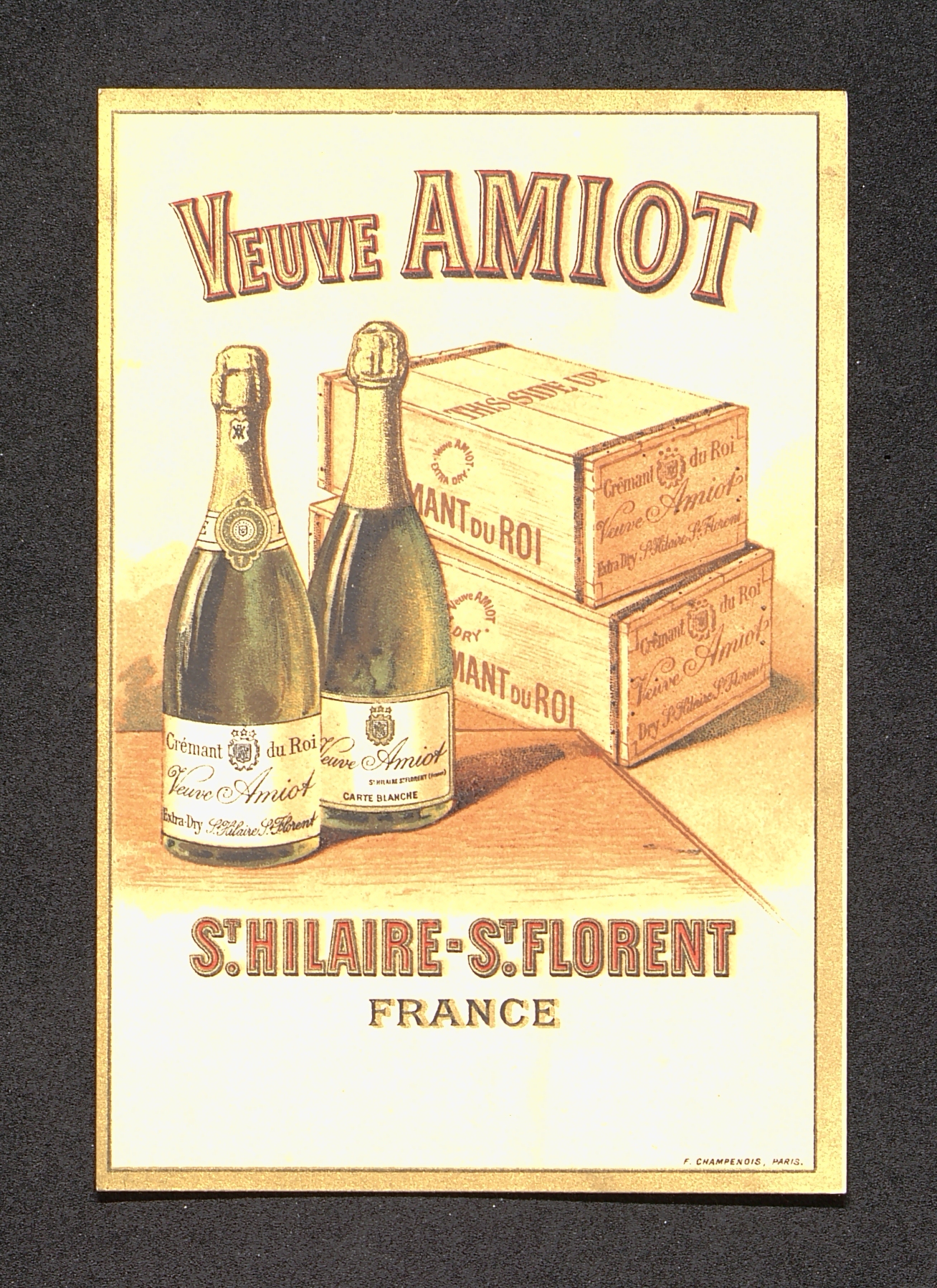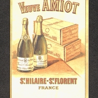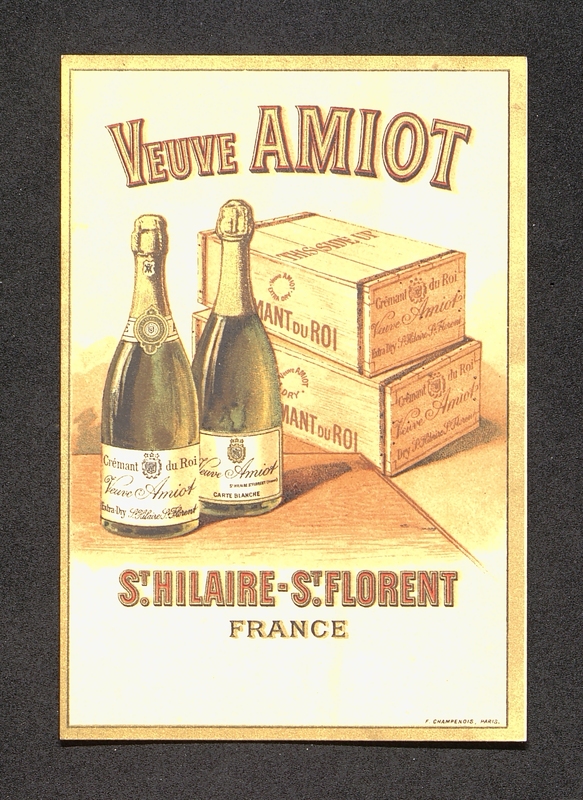 Carte publicitaire illustrée pour les crémants Veuve Amiot, avec tarifs au dos de cette carte.