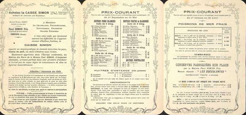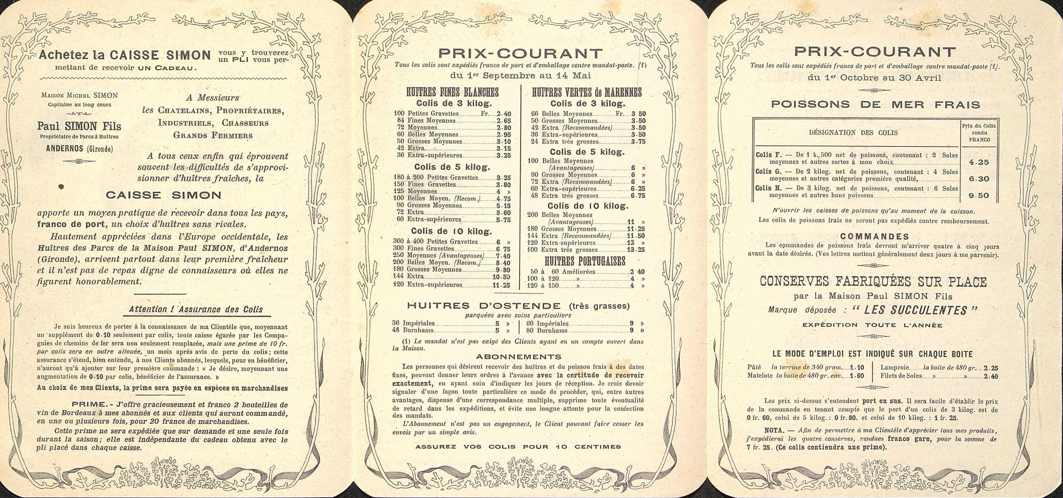 Dépliant publicitaire des Huîtres fines Paul Simon en colis postaux. Tarifs et produits dérivés.