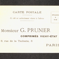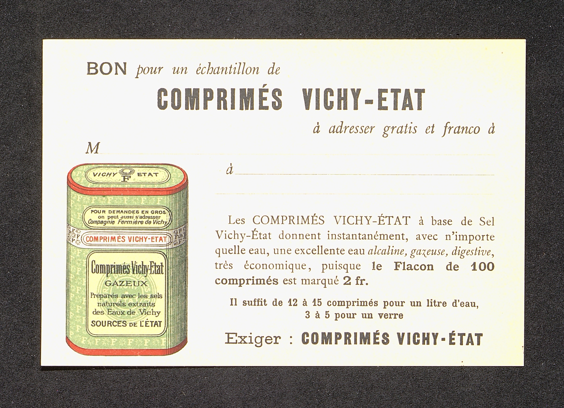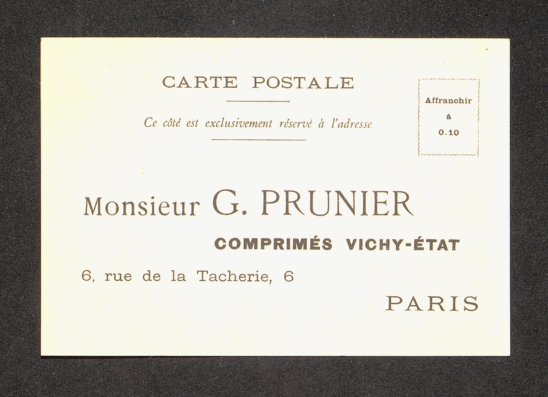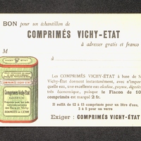 Carte publicitaire illustrée pour les Comprimés Vichy-Etat. Au dos l'adresse du représentant à contacter sous forme de carte-postale.