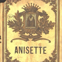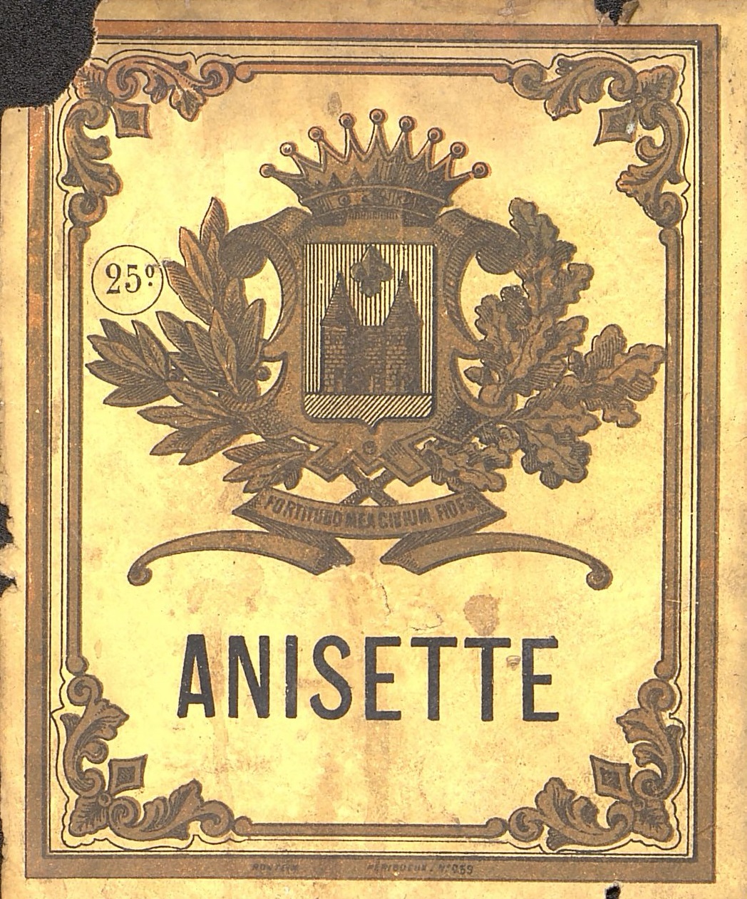 Etiquette d'une bouteille d'anisette aux armes de la ville d'Angoulême et avec sa devise.