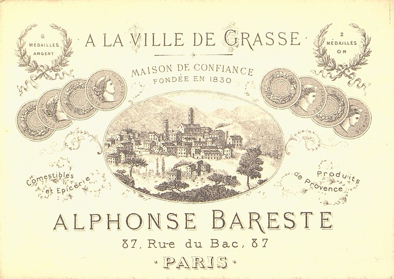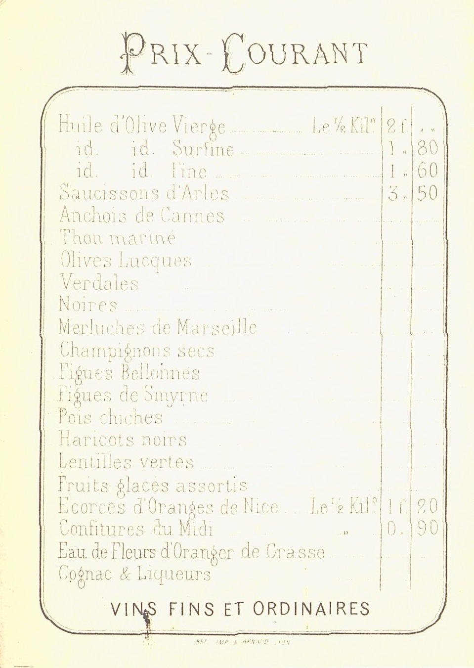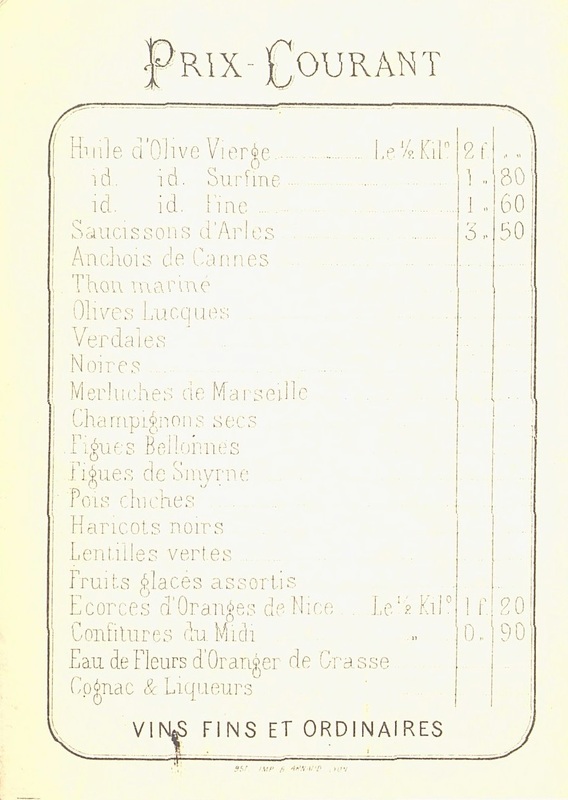 Carte publicitaire illustrée portant au revers le détail des produits ainsi que leur tarif. Essentiellement des produits Provençaux, méditerranéens.