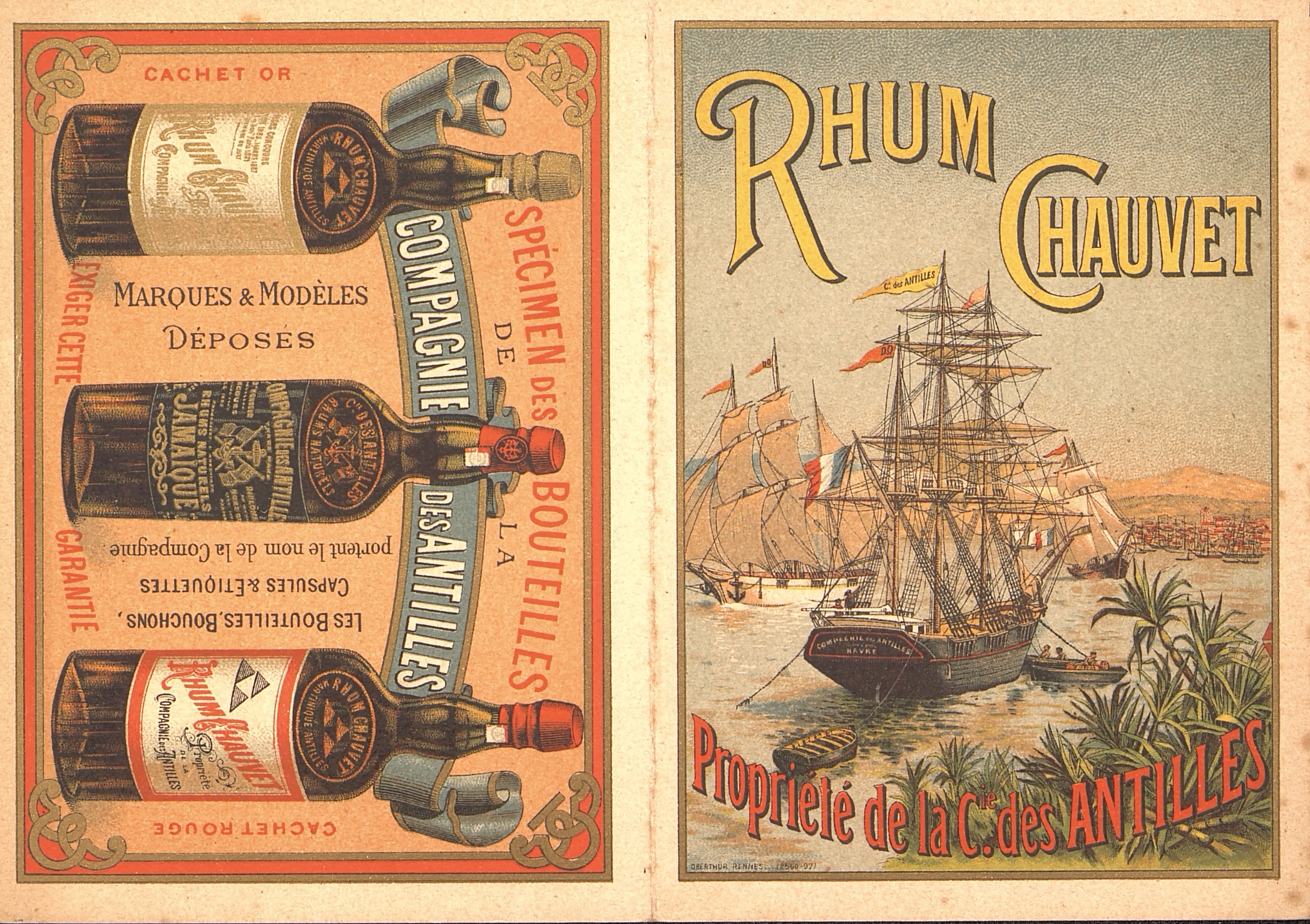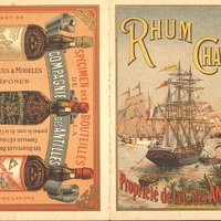 illustration : navires à voiles battant le pavillon français au large des Antilles . Spécimen de trois bouteilles de Rhum. Au verso : Garanties qualités et catalogue des tarifs.