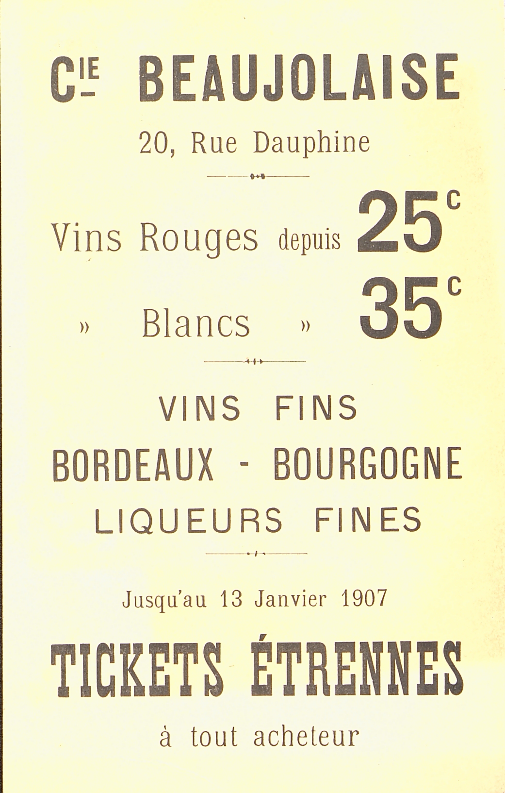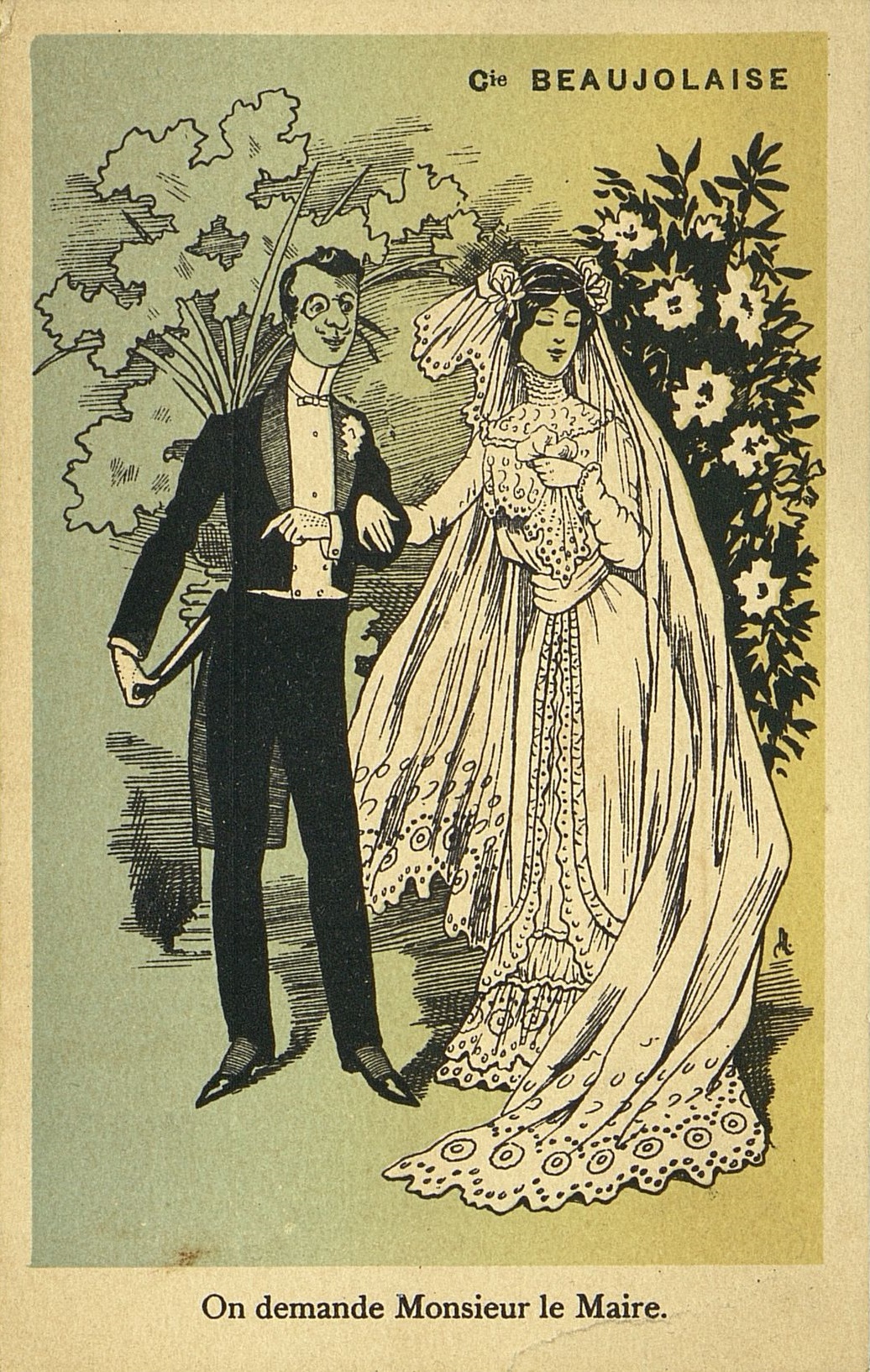 - Image publicitaire de la Compagnie Beaujolaise avec un couple de mariés et au dos les tarifs des produits. Vignette publicitaire. "On demande Monsieur le maire"