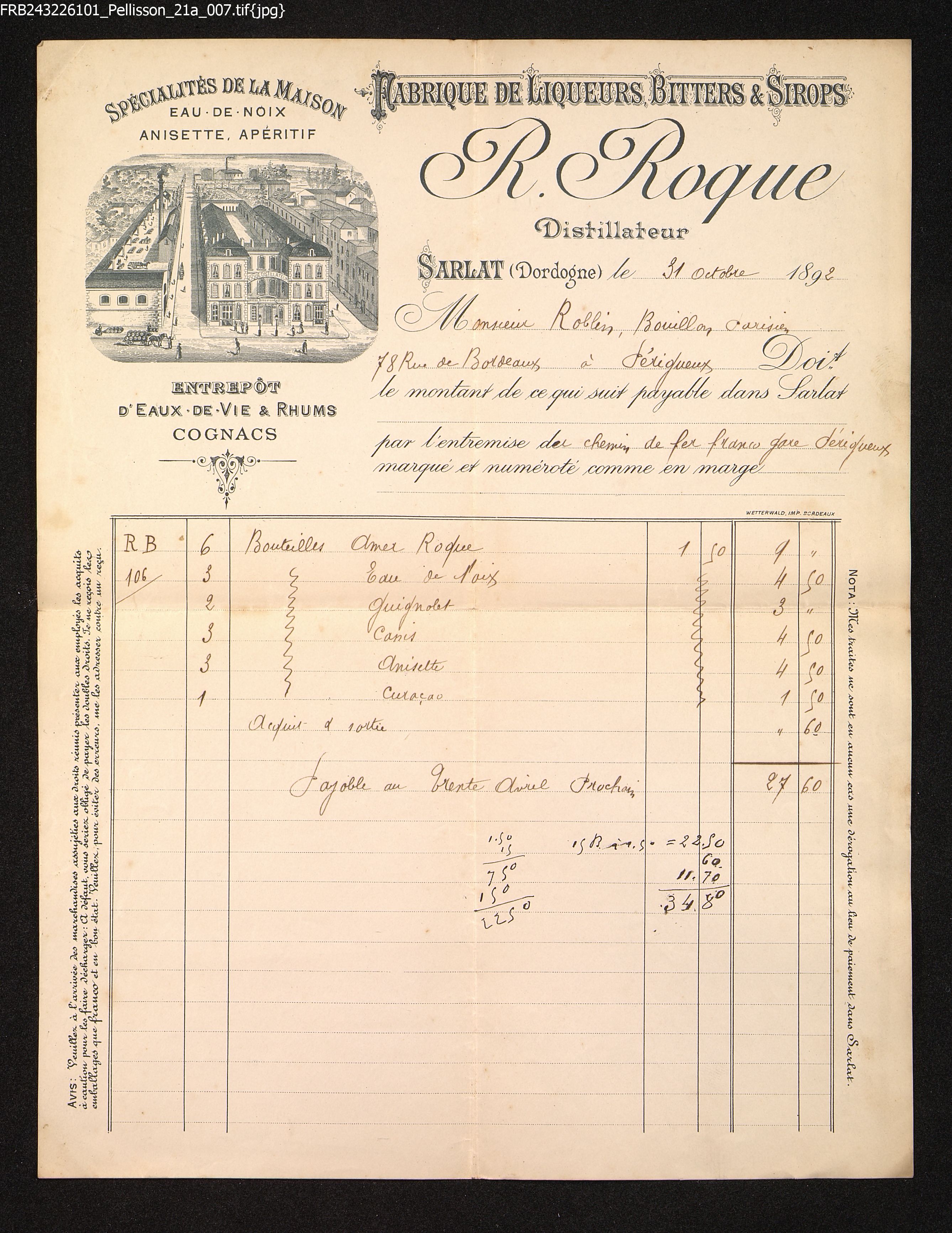 Facture envoyée à Monsieur Robin, Bouillon, Parisien, 78 rue de Bordeaux à Périgueux.