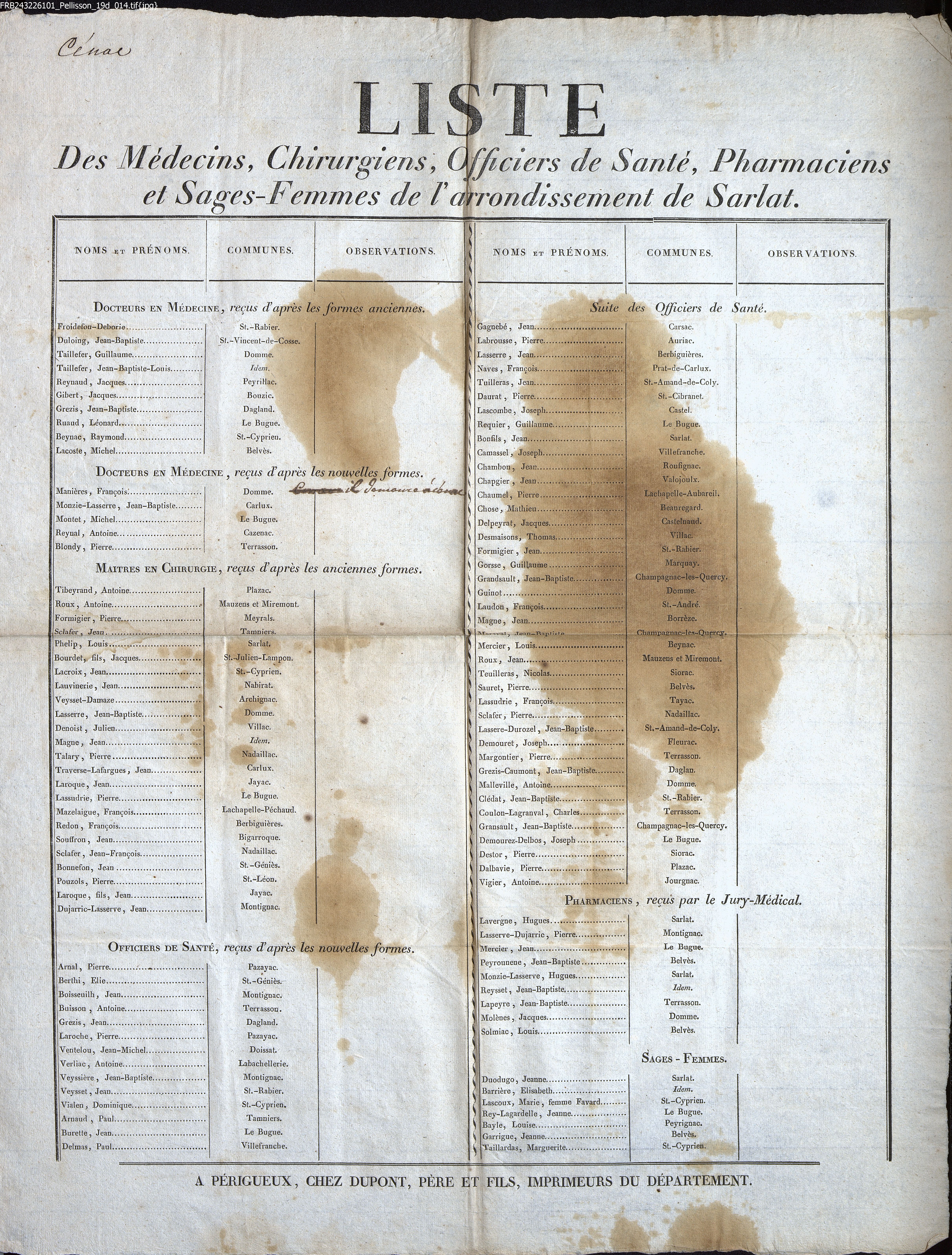 Liste des Médecins, Chirurgiens, Officiers de Santé, Pharmaciens et Sages-Femmes de l'arrondissement de Sarlat