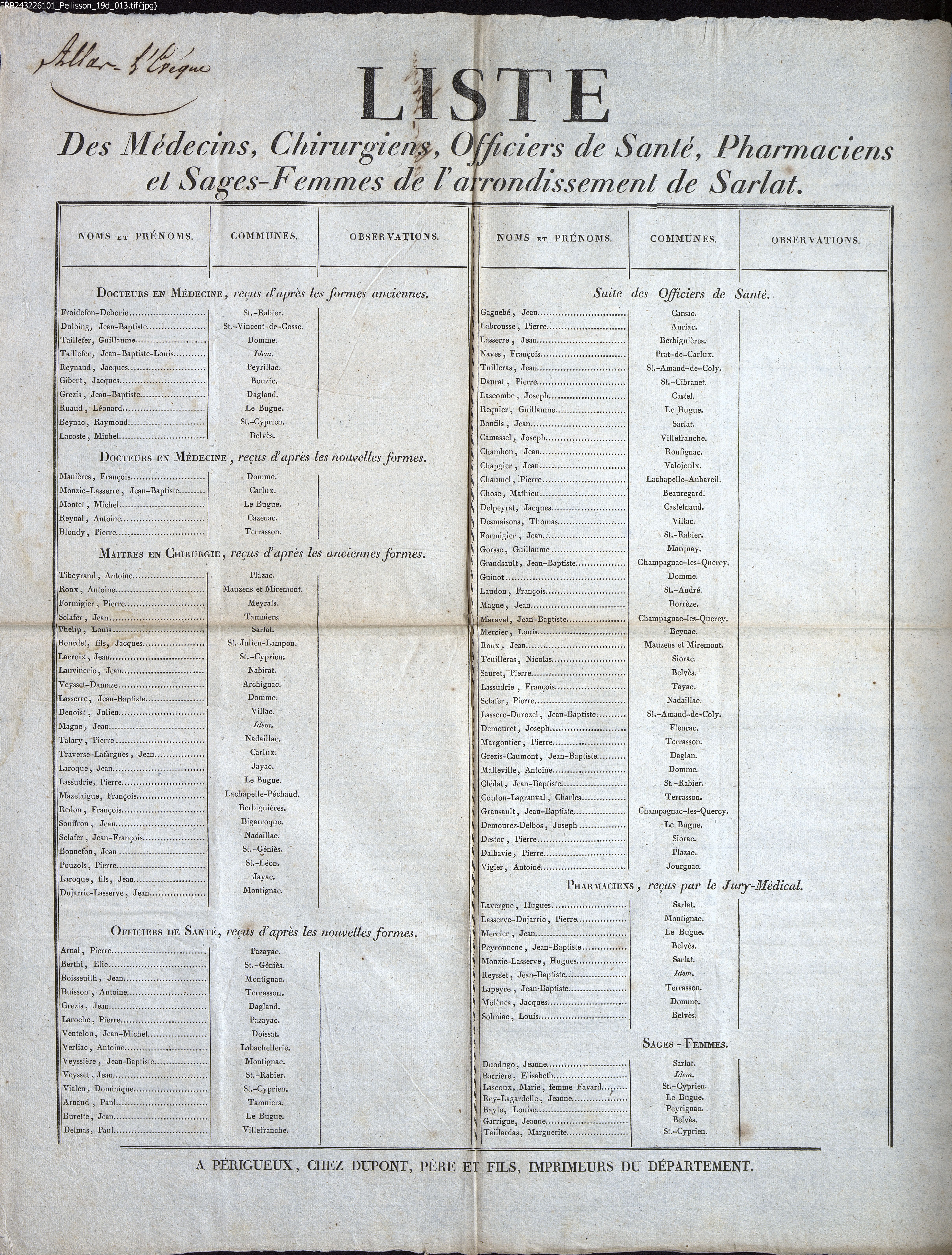 Liste des Médecins, Chirurgiens, Officiers de Santé, Pharmaciens et Sages-Femmes de l'arrondissement de Sarlat