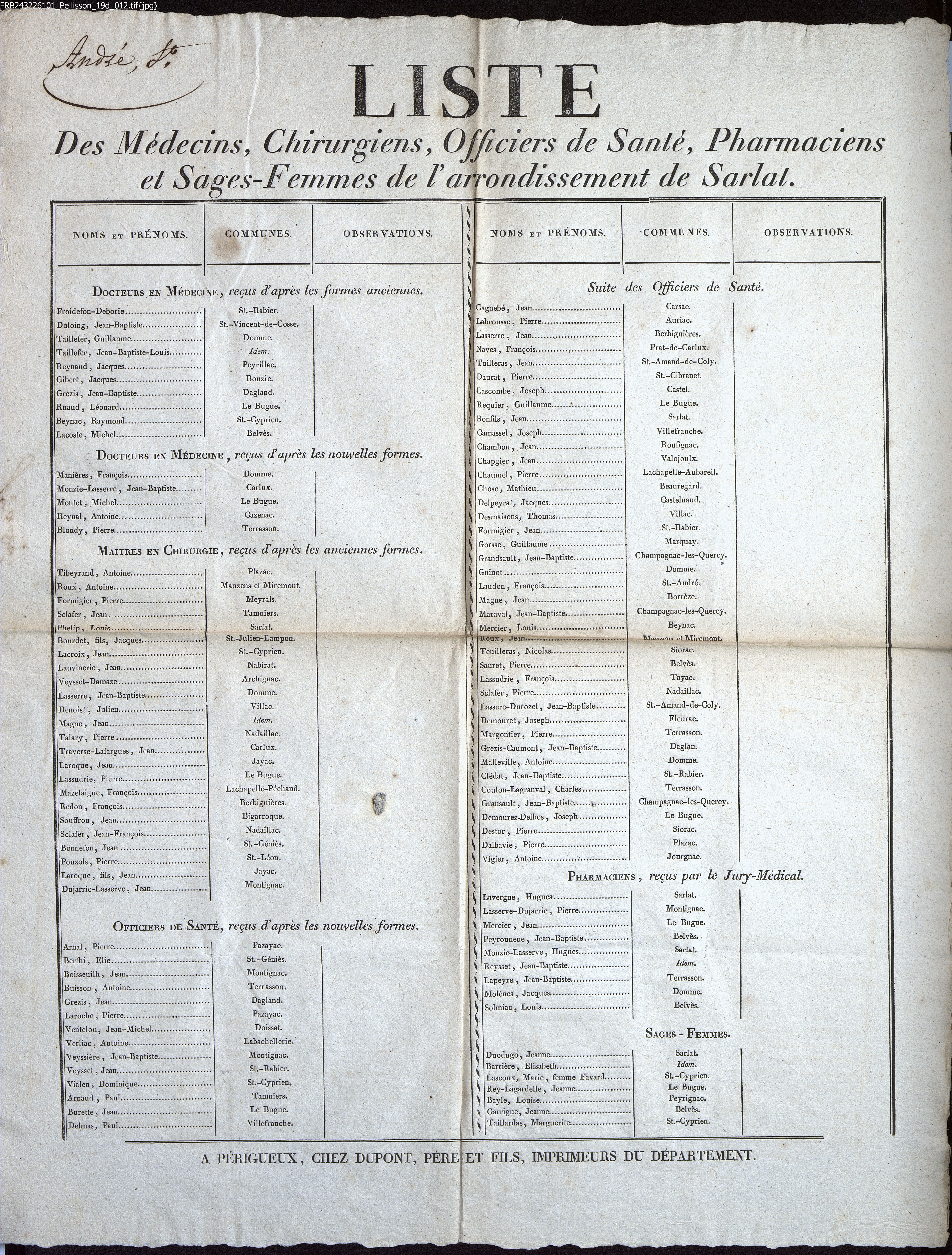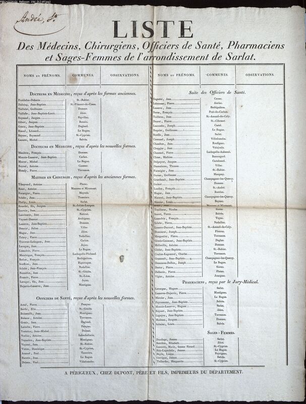 Liste des Médecins, Chirurgiens, Officiers de Santé, Pharmaciens et Sages-Femmes de l'arrondissement de Sarlat