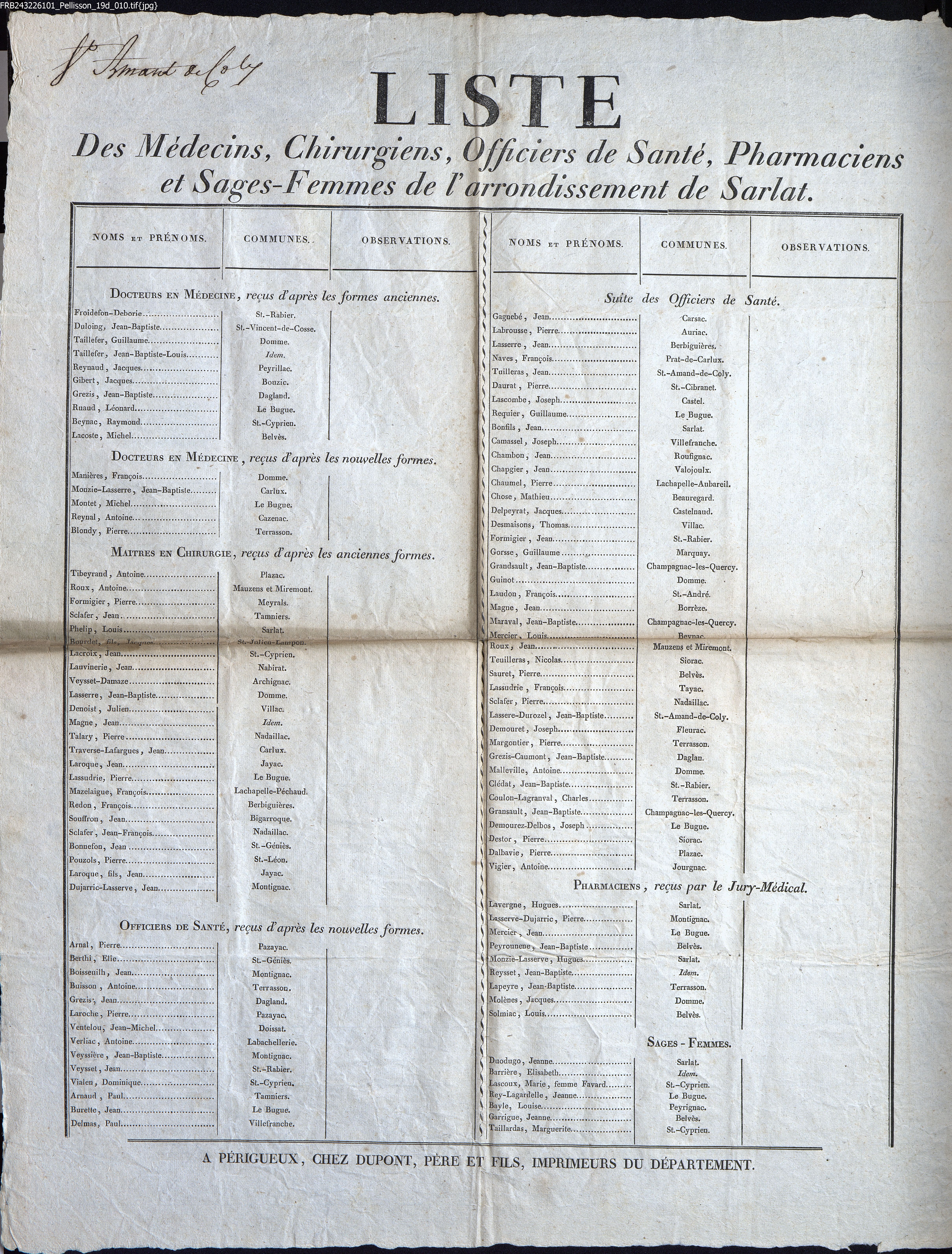 Liste des Médecins, Chirurgiens, Officiers de Santé, Pharmaciens et Sages-Femmes de l'arrondissement de Sarlat