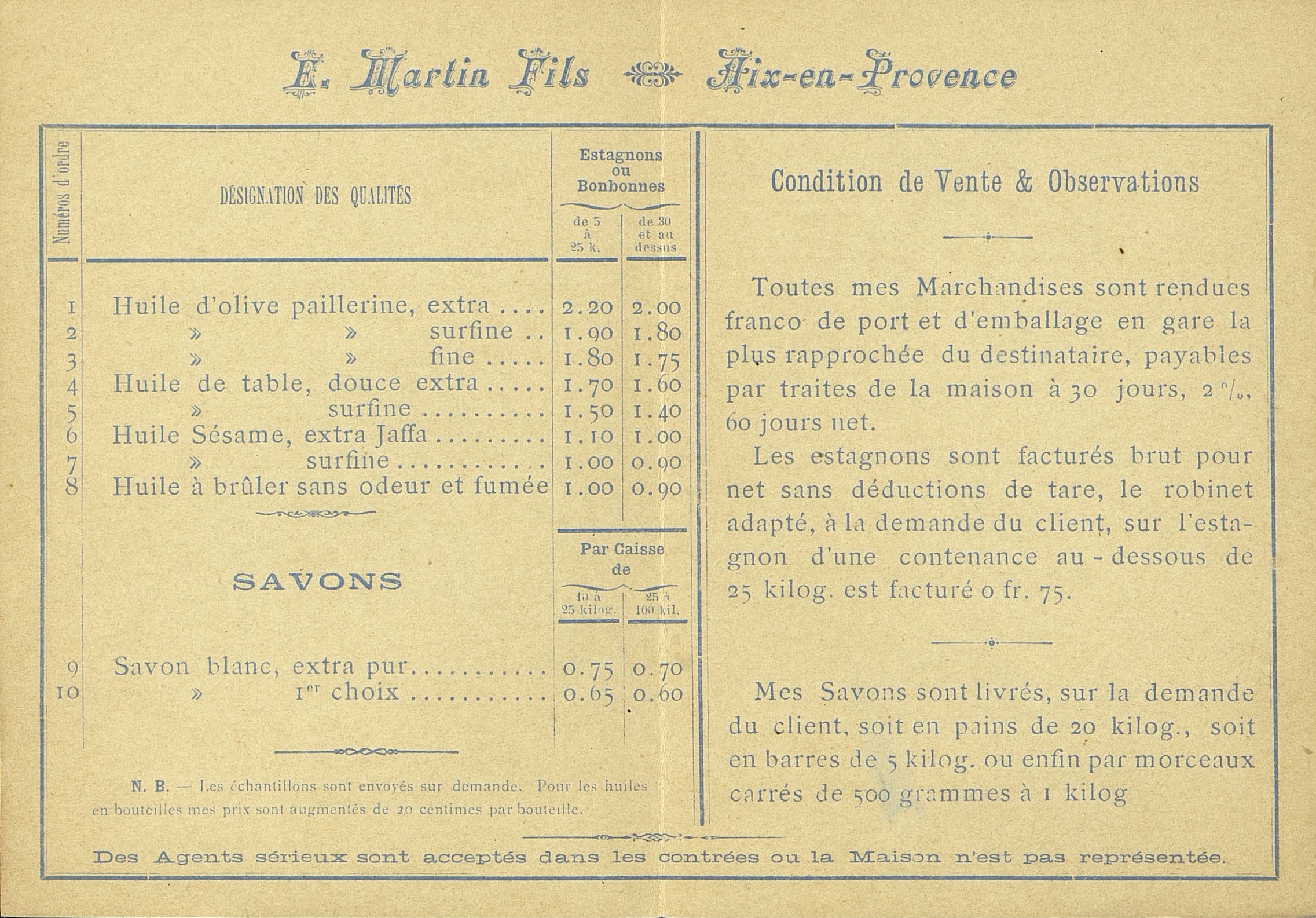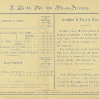 Dépliant publicitaire expédié par la poste, du producteur d'huiles, E. Martin. A l'intérieur, la désignation des produits et les conditions de vente