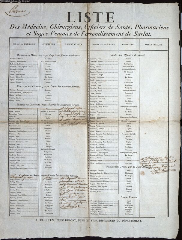 Liste des Médecins, Chirurgiens, Officiers de Santé, Pharmaciens et Sages-Femmes de l'arrondissement de Sarlat