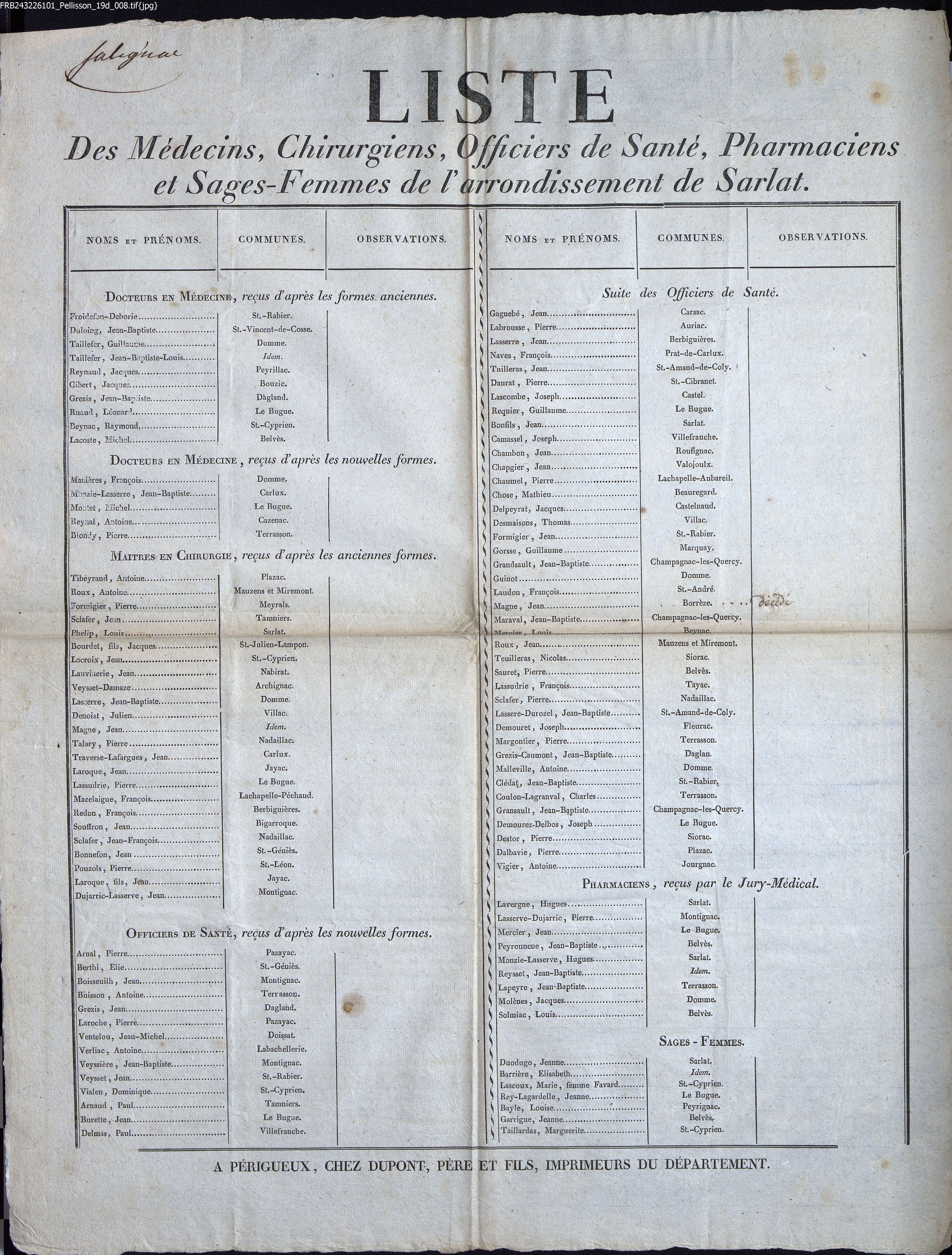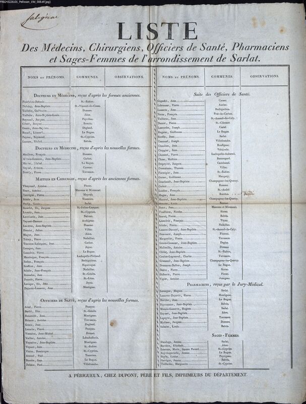 Liste des Médecins, Chirurgiens, Officiers de Santé, Pharmaciens et Sages-Femmes de l'arrondissement de Sarlat