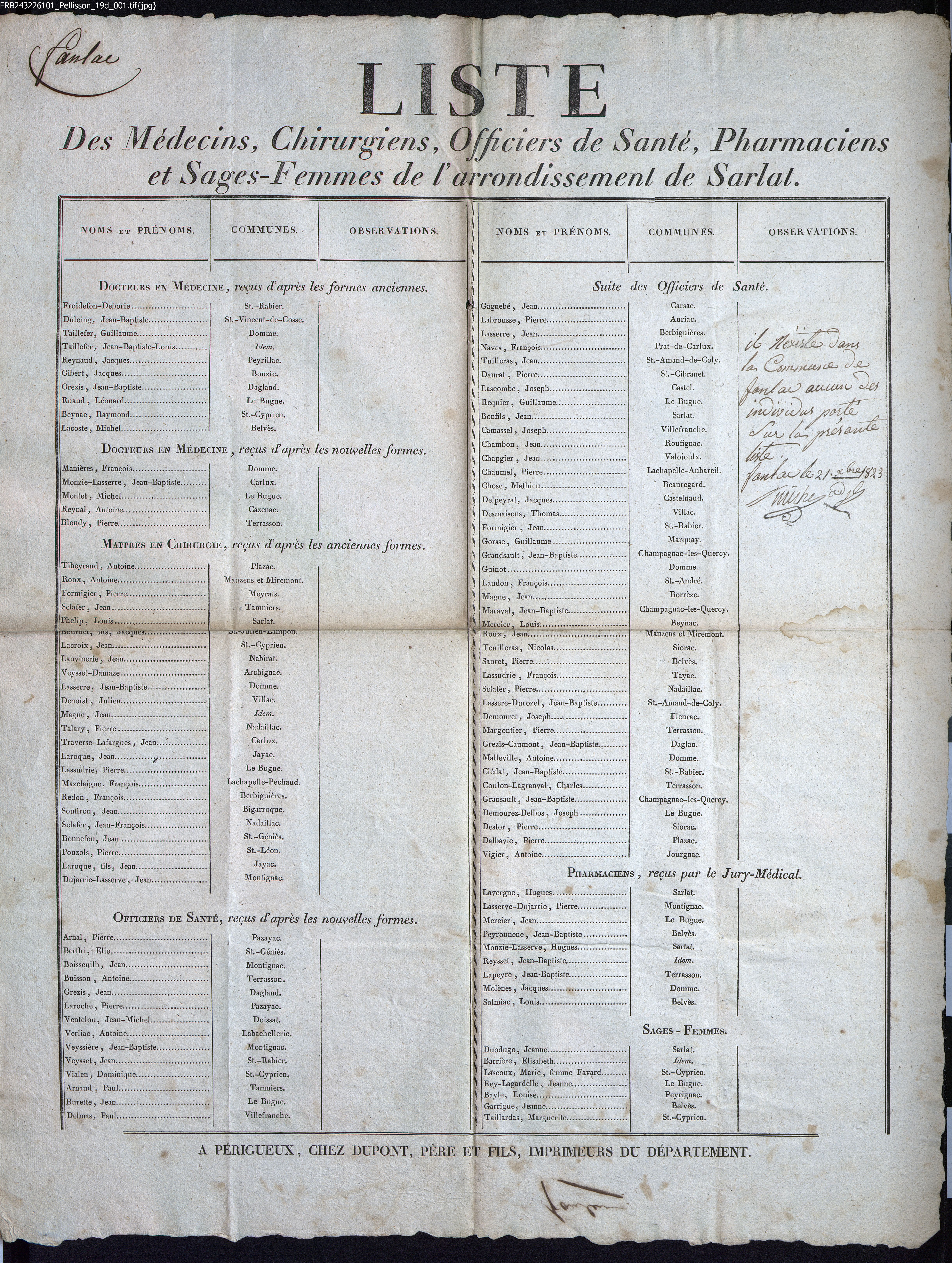 Liste des Médecins, Chirurgiens, Officiers de Santé, Pharmaciens et Sages-Femmes de l'arrondissement de Sarlat