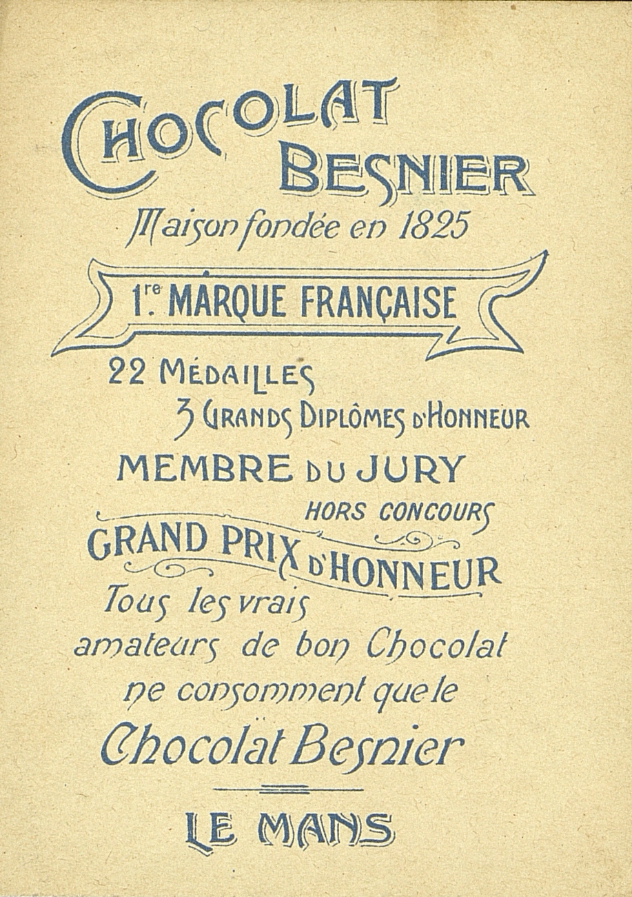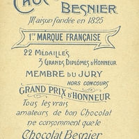 Carte publicitaire pour le chocolat Besnier. Au dos le texte publicitaire.