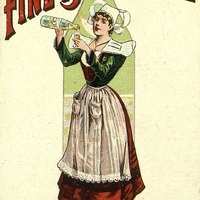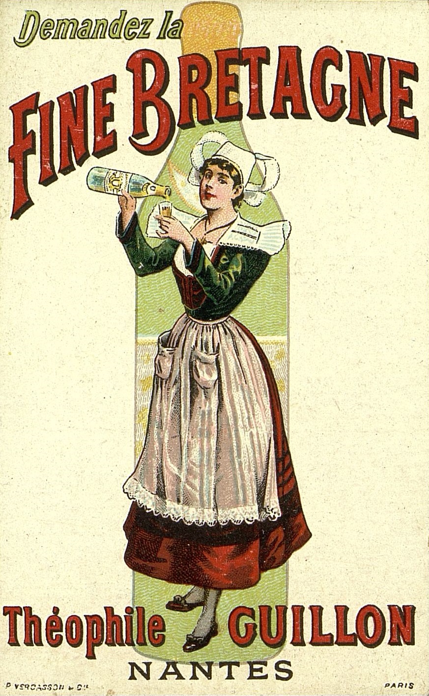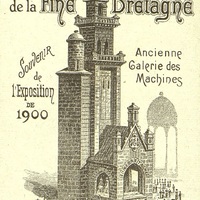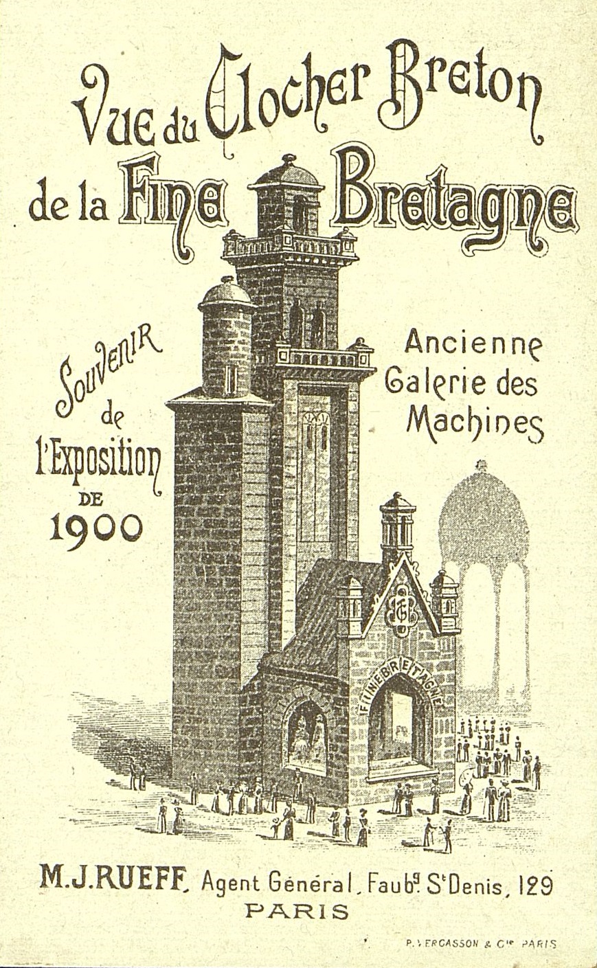 Carte publicitaire illustrée de la Fine Bretagne de Théophile Guillon, producteur à Nantes. Au dos, une illustration rappelant le pavillon de la Bretagne" Vue du clocher" à l'Exposition de 1900. M. J. Rueff, Agent général à Paris.