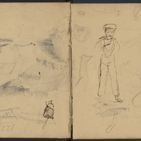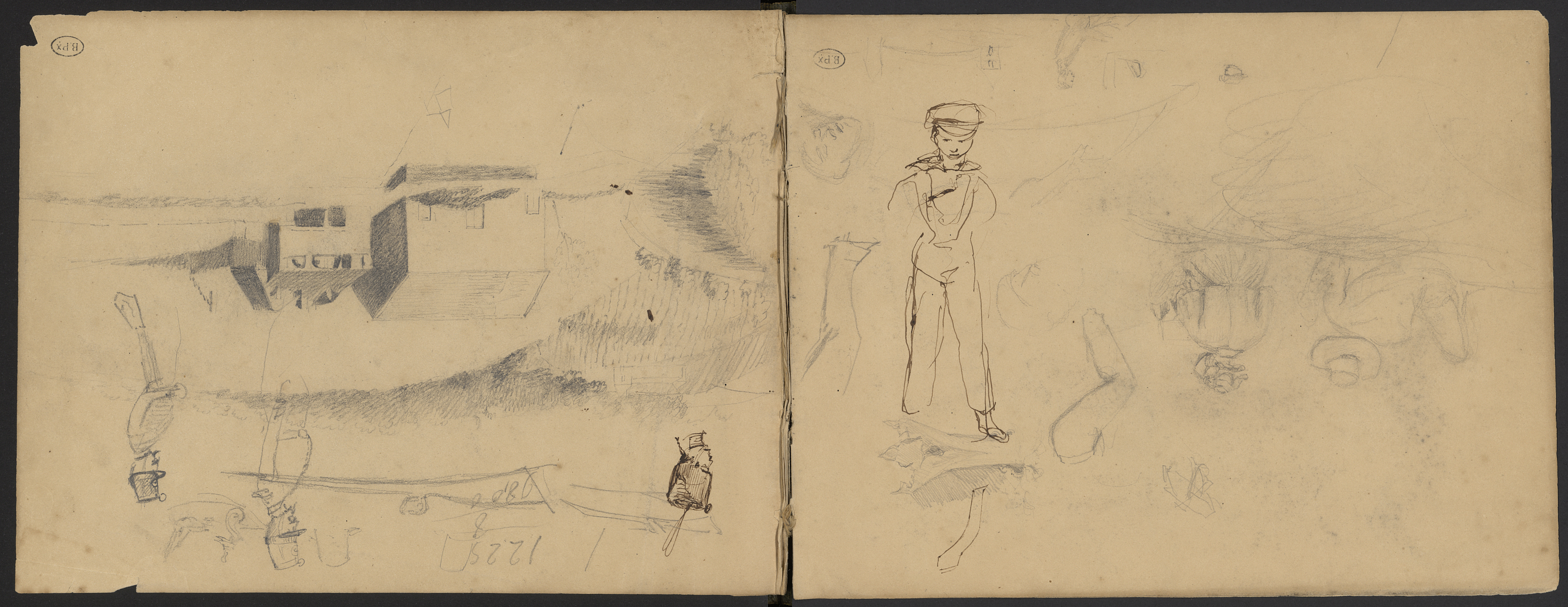 Deux personnages assis : un homme au chapeau à bords larges, une femme à chapeau au ruban, vus de dos, un jeune homme à la casquette . Des bâtiments de fermes dans un paysage rural, profil d'une tête de soldat au bonnet de grenadier à poil ou peau d'ours de la période impériale, deux soldats en uniforme au shako Empire et à la moustache impériale, esquisse d'un fusil et pièce d'amorce.