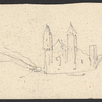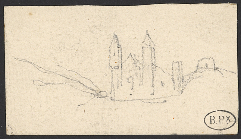 Esquisse d'une église fortifiée avec donjon de pierre sur motte