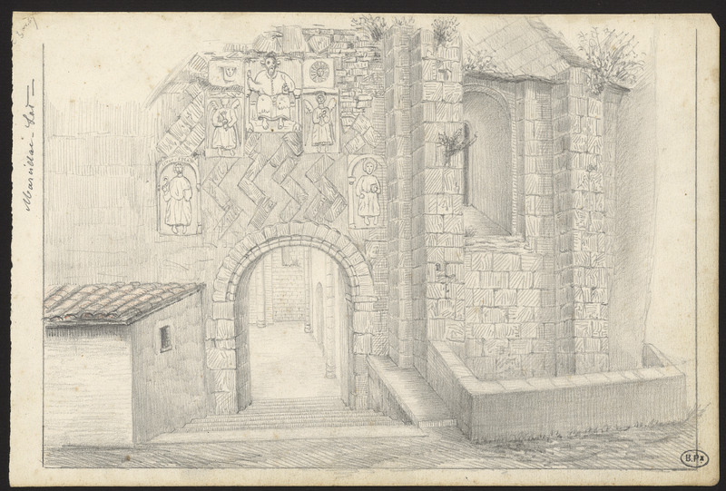 Portail monumental sud du cloître arc roman à moulure en boudin orné d'un Christ en majesté sur un trône encadré du soleil et d'un visage féminin et deux anges dont l'un tient un sceptre et de deux saints dont un est Saint Pierre tenat une clé protecteur de l'abbaye "petrus apostolus" et Saint Paul tenant un livre dans un appareil opus spicatum ou en chevron.