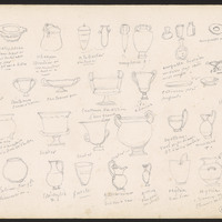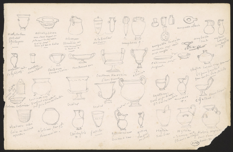 Types dessinés : acetabulum gobelet (nom en caractères grecs) [petit vase à vinaigre] , acratophoron : vase dans lequel on plaçait ...le vin ... que le ... , ahenum chaudière ou marmite à anse, deux alabastres toilette, deux amphores, trois ampulla bouteilles en verre col étroit... , Calix (ratures) ....ampulla oleana, aryballe huile, aryballe ... Bombylios id[em], Cryleu (sic), aryballe vin ...Cotyliscos [petit cratère], calathus verre à boire, cantharos [= canthare] coupe à boire, cantharos grec, trois cratères, cantharos karkesion...., Id[em] à boire, Catinum [= Creuset] plat profond, Chytra...grecque comme grand ...familier...à pieds, Cista avec ou pas de pied, Calum passoire, Cortina vase profond et circulaire p(ou)r faire ..., Trois craters, Cyathus vase de p(etite) dim(ension)...huiles [Du grec ancien κύαθος, kyathos (« coupe, récipient »)], oenochoé [ une œnochoé (prononciation traditionnelle: /enɔkɔe/ ; prononciation courante : /ø-/ ; du grec ancien οἰνοχόη / oinokhóê, d'οἶνος / oĩnos, le « vin », et χέω / khéô, « verser ») est un pichet à vin qui sert à puiser le vin dans le cratère — où il a été coupé à l'eau ], Cyathus..., Latresa [Chalcolithique] vase à boire en métal apode, Bolium, très grande dimension, Strichysis, butile (sic) vin, gutlumium cruche à eau, Gutlus..., deux hydria une pour l'eau , une à trois anses pl(u)s anse à l'orifice, kalpis hydria [= une hydrie ou kalpis (en grec ancien ὑδρία / hydría ou κάλπις / kálpis)]
