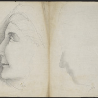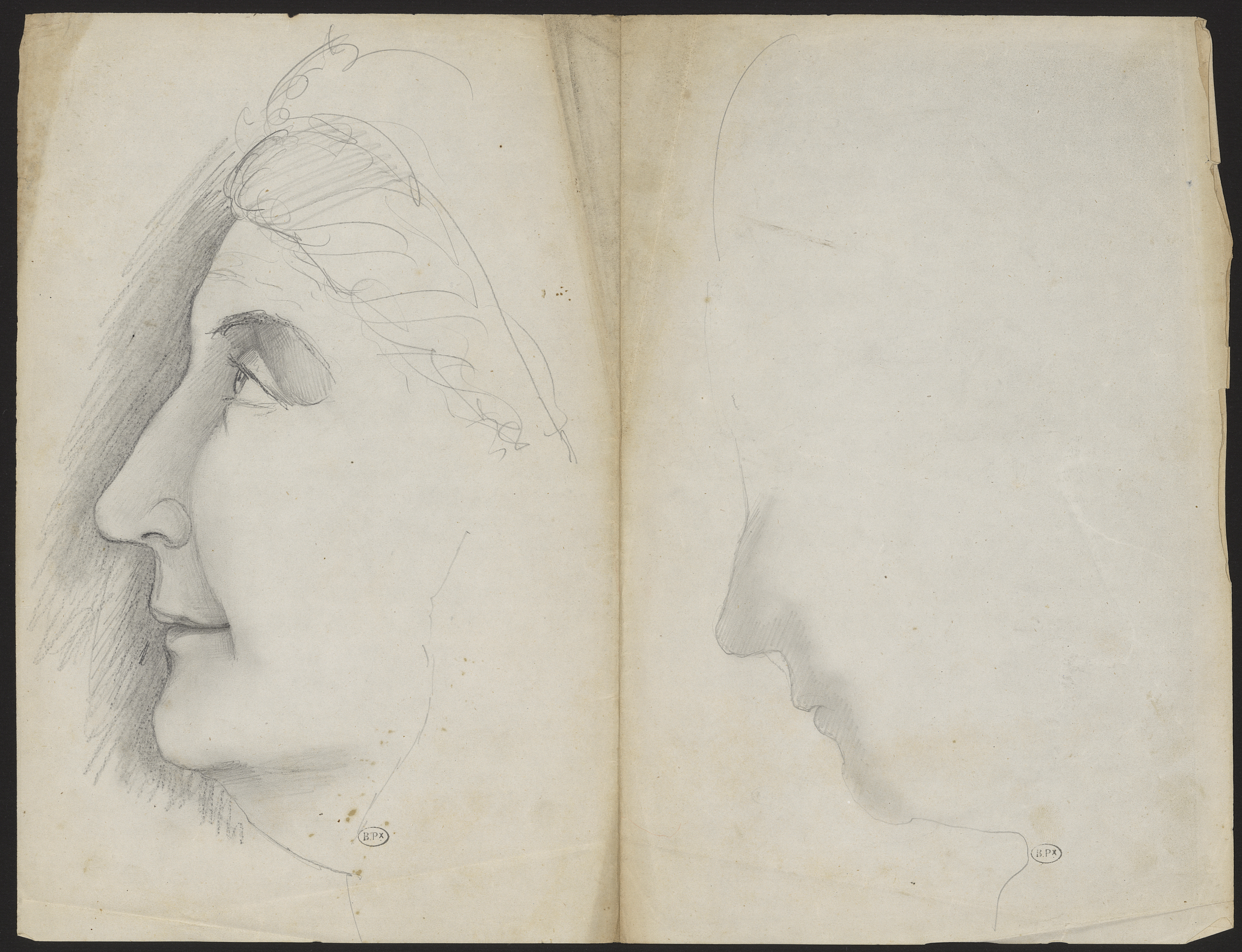 Sur double page du feuillet précèdent : profil de femme âge mûr, et simple esquisse d'un autre personnage