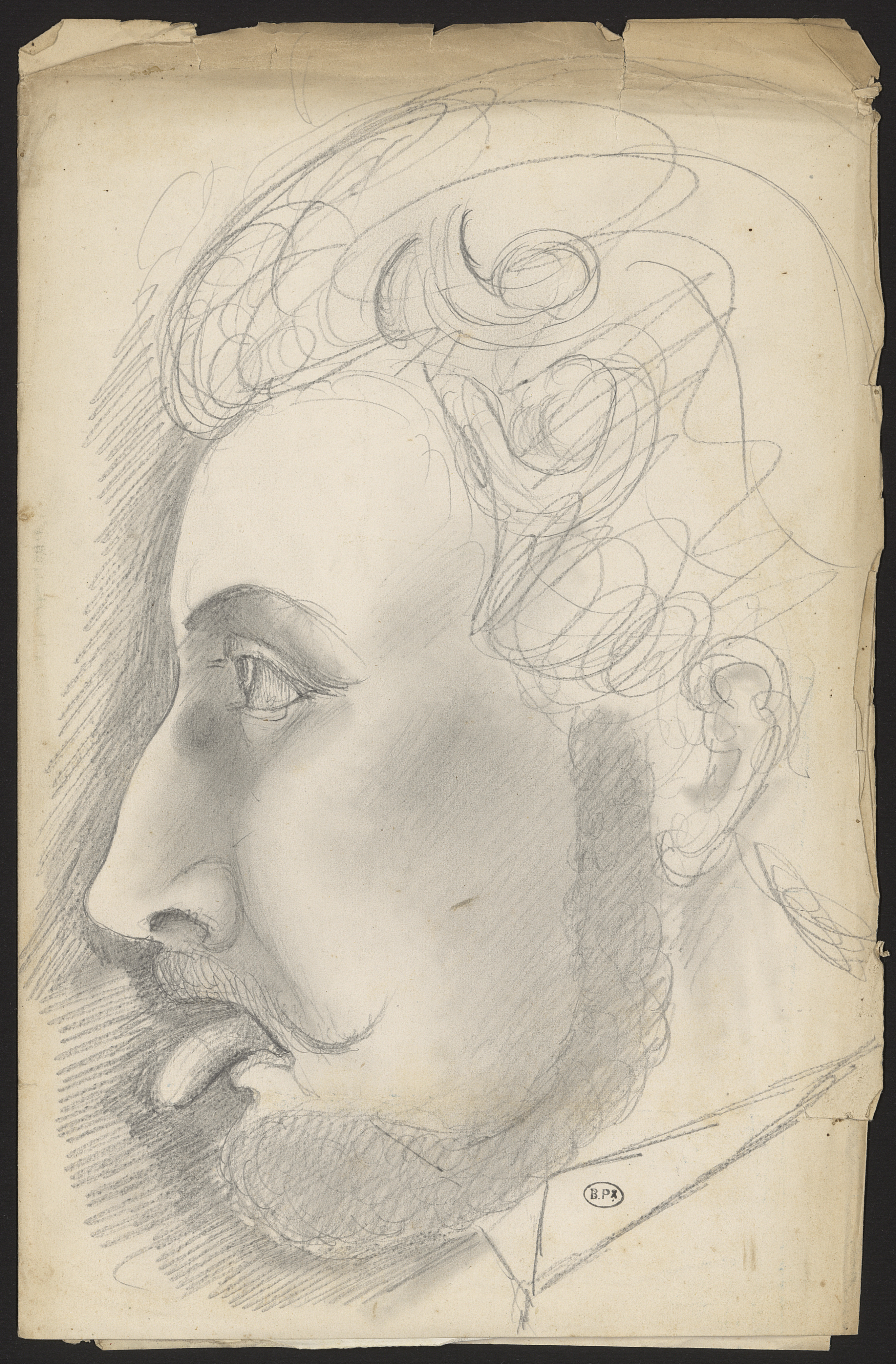 Profil gauche d'un personnage barbu tirant la langue (feuillet plié en deux)