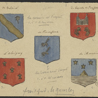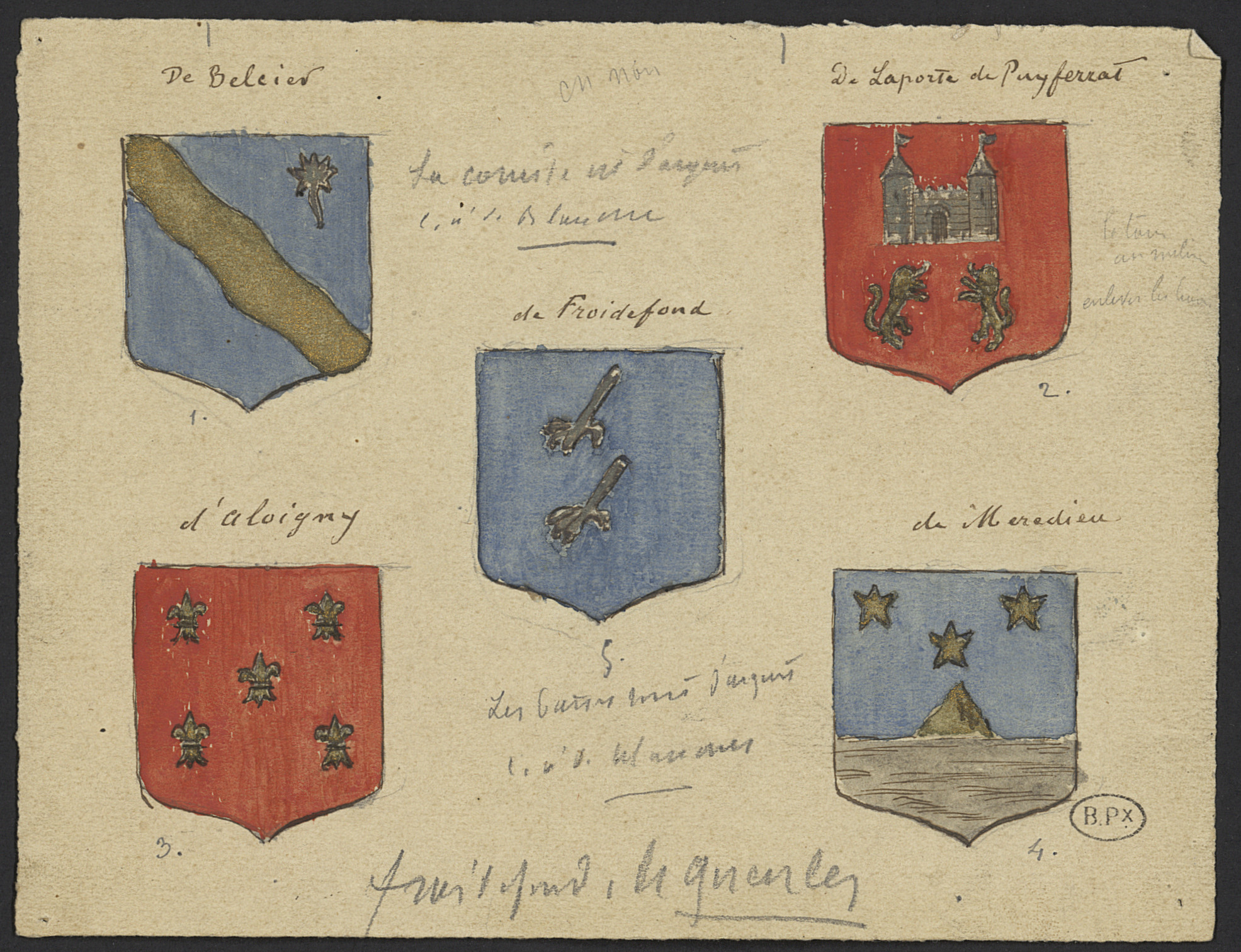 5 blasons en couleurs d'après Froidefond, en rapport avec La Rolphie. De Belcier, de Laporte de Puyferrat, de Reoidefond, d'Aloigny,de Meredieu.