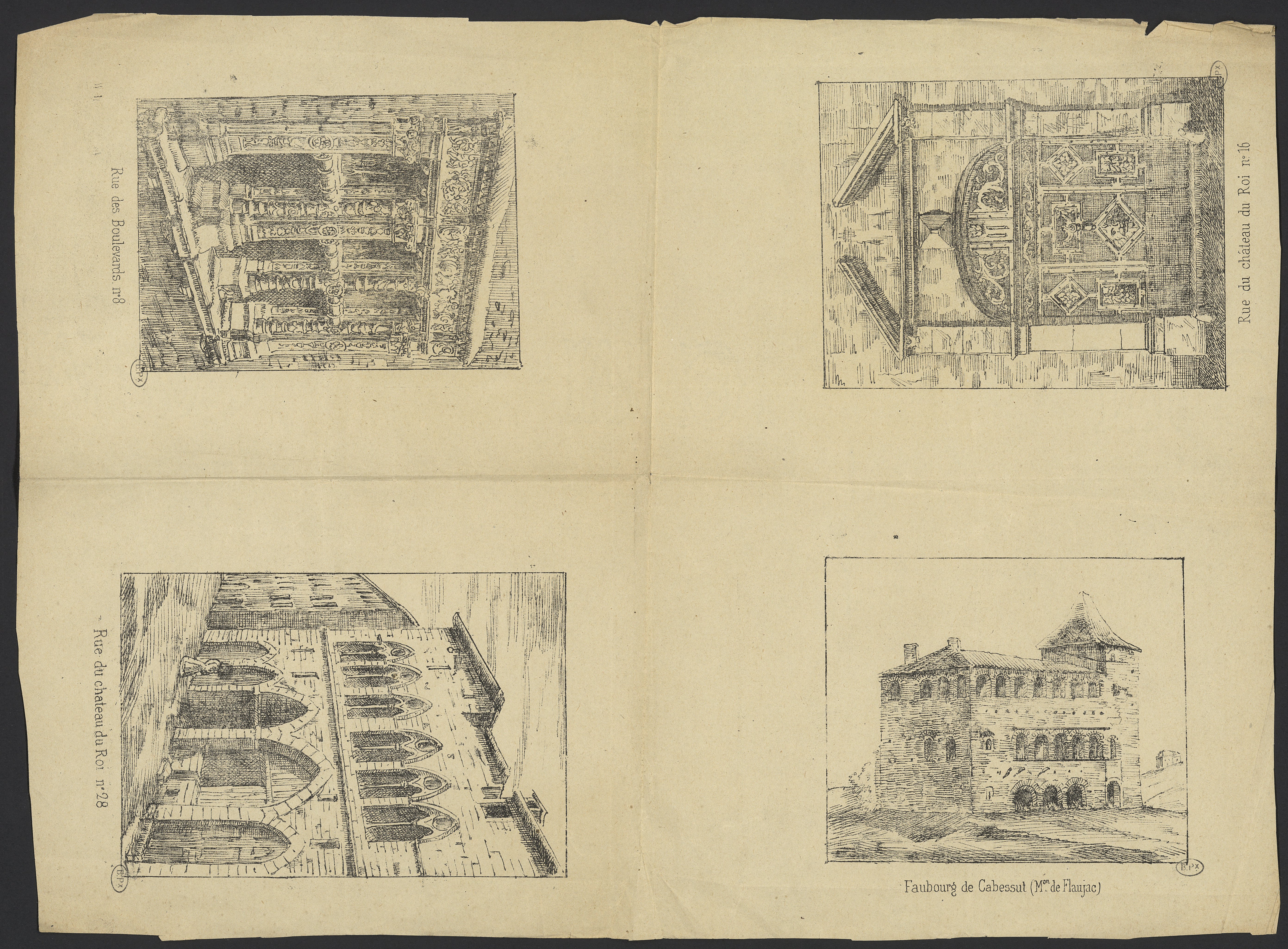 - Baie sculptée à meneaux du N° 8 Rue des Boulevards. Façade de l'hôtel N° 28 de la Rue du Château du Roi. Portail à la porte en bois sculptée de mascaron feuillages au N° 16 de la Rue du Château du Roi. Maison de Flaugeac au Faubourg de Cabessut.