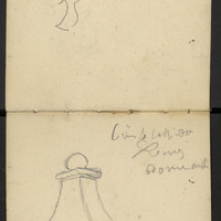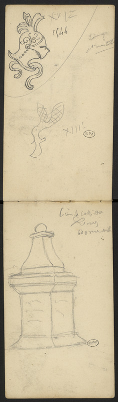 Vagues croquis sur deux pages : [une borne] prés la cathédrale, un heaume de chevalier