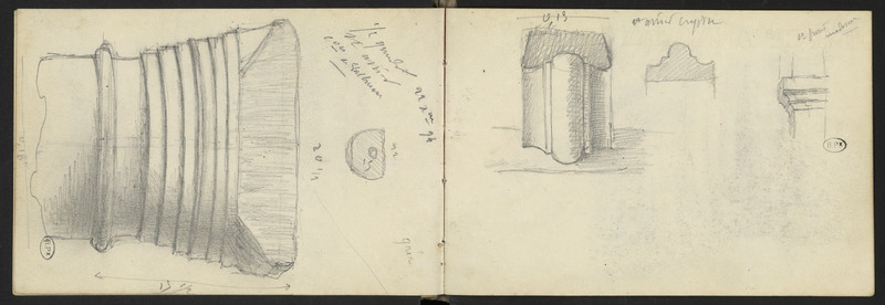 Chapiteau, éléments architecturaux difficilement attribuables ; sur deux pages