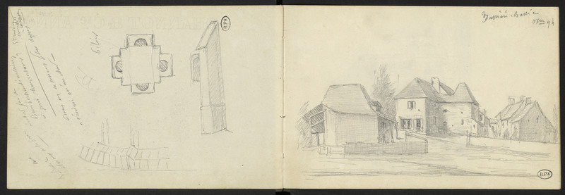 Notes manuscrites et petits dessins : coupe de pilier avec colonnes engagées, contrefort et arc.