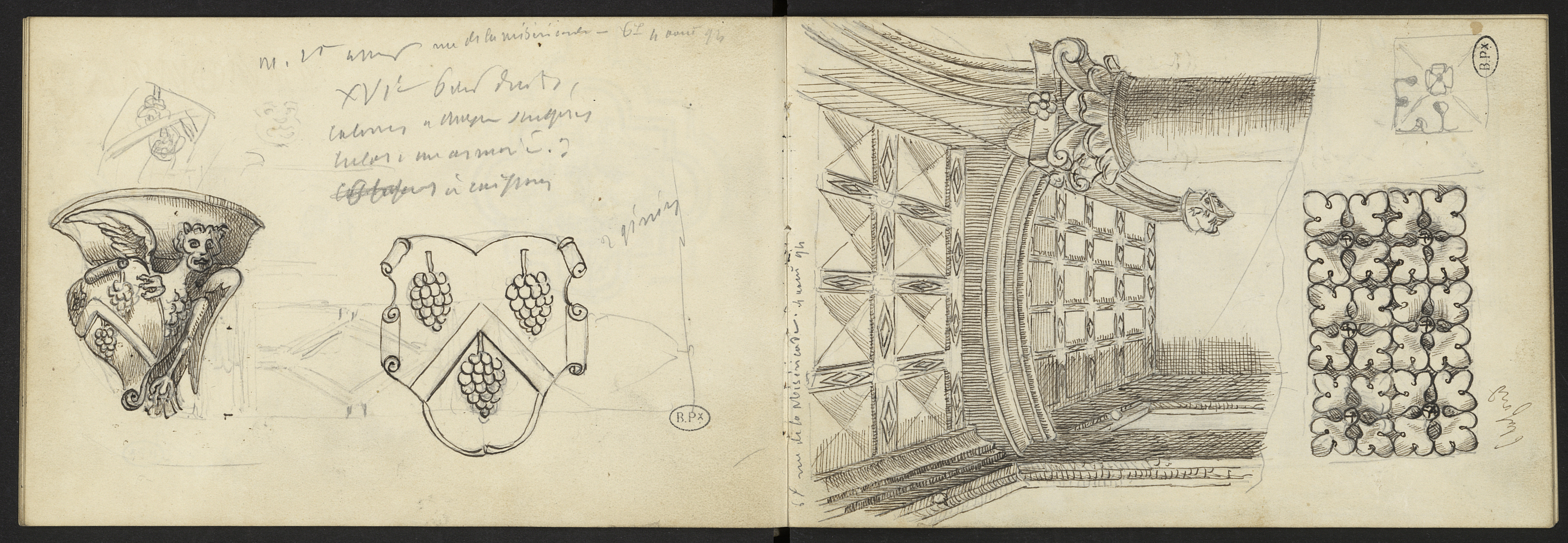 Décors de plafond, rue de la Miséricorde. Armoiries sur cul-de-lampe.