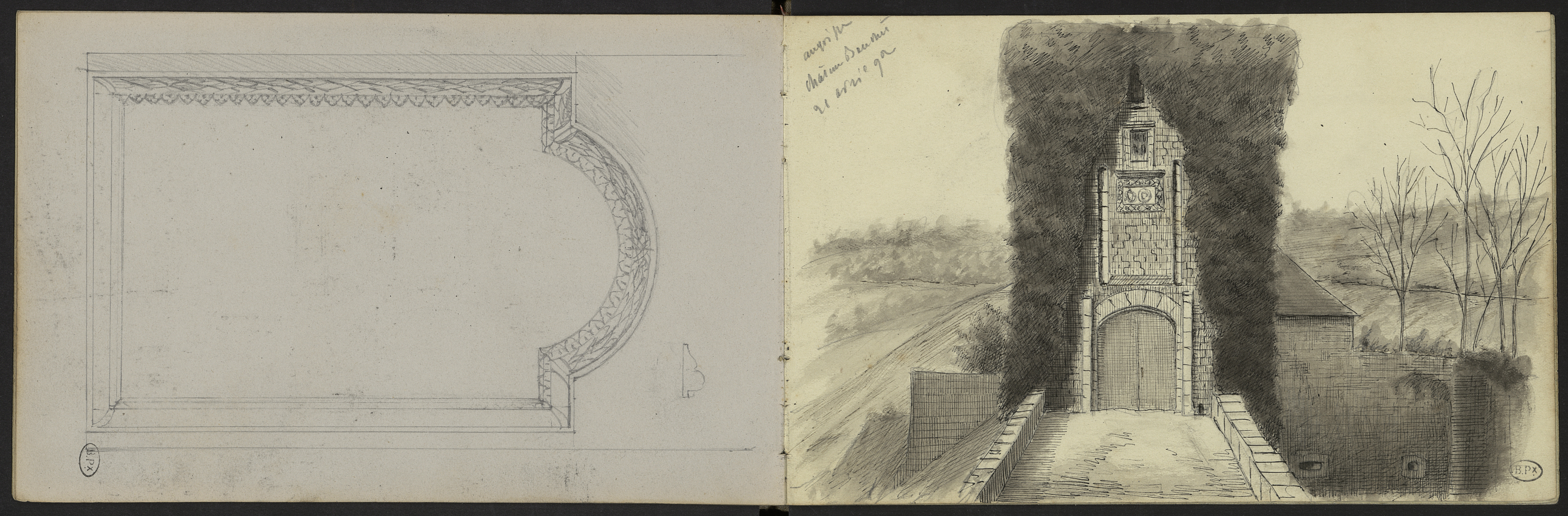 Château Bouché : Châtelet d'entrée à pont-levis coiffée de verdures. Boiserie à encadrement sculpté.