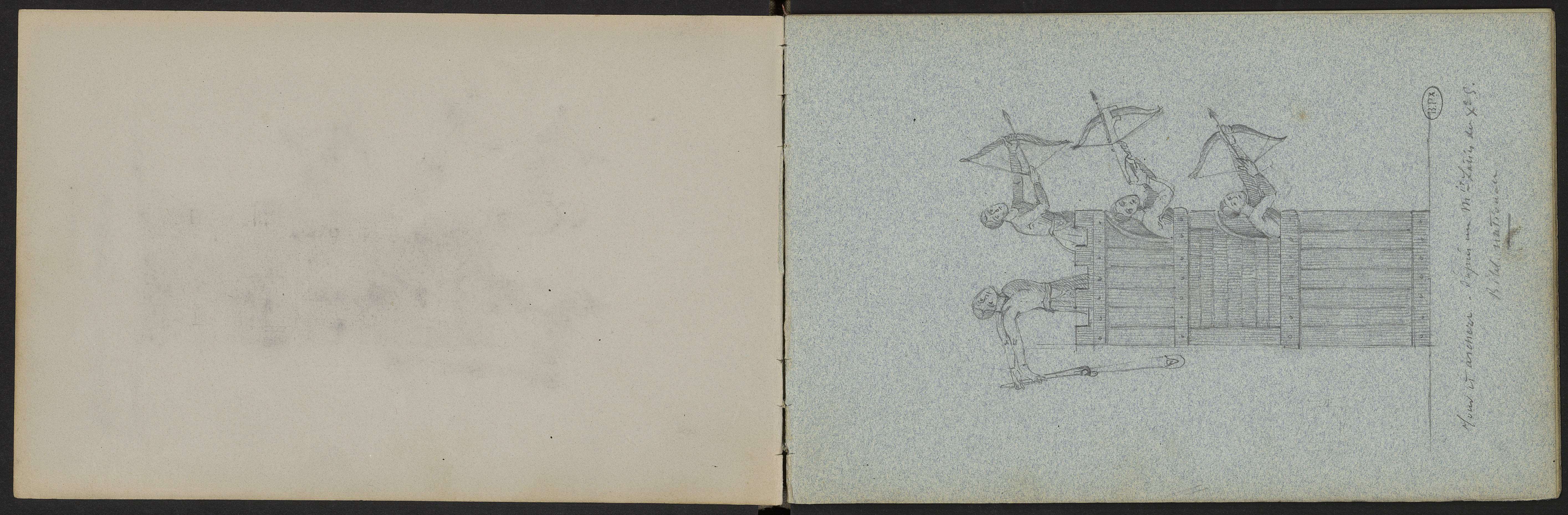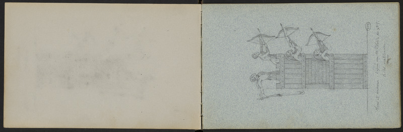 Tour carrée palissée en bois avec trois archers et un frondeur en encorbellement .Dessin d'après un manuscrit de la Bibliothèque nationale du XIe siècle.