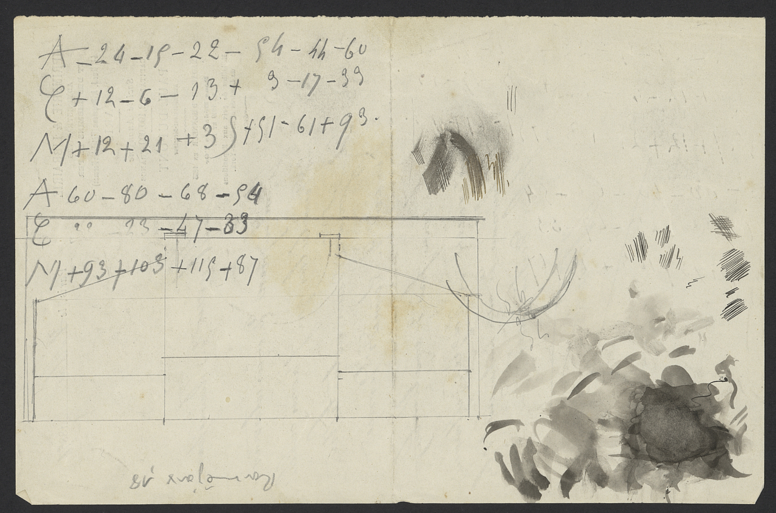 Verso de la lettre, portant des séries de chiffres et des taches d'encre