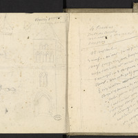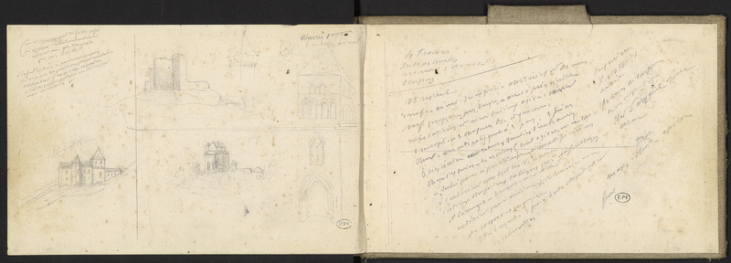 Esquisse du clocher de l’ église de Thiviers. Croquis du Château d'Agonac (?)