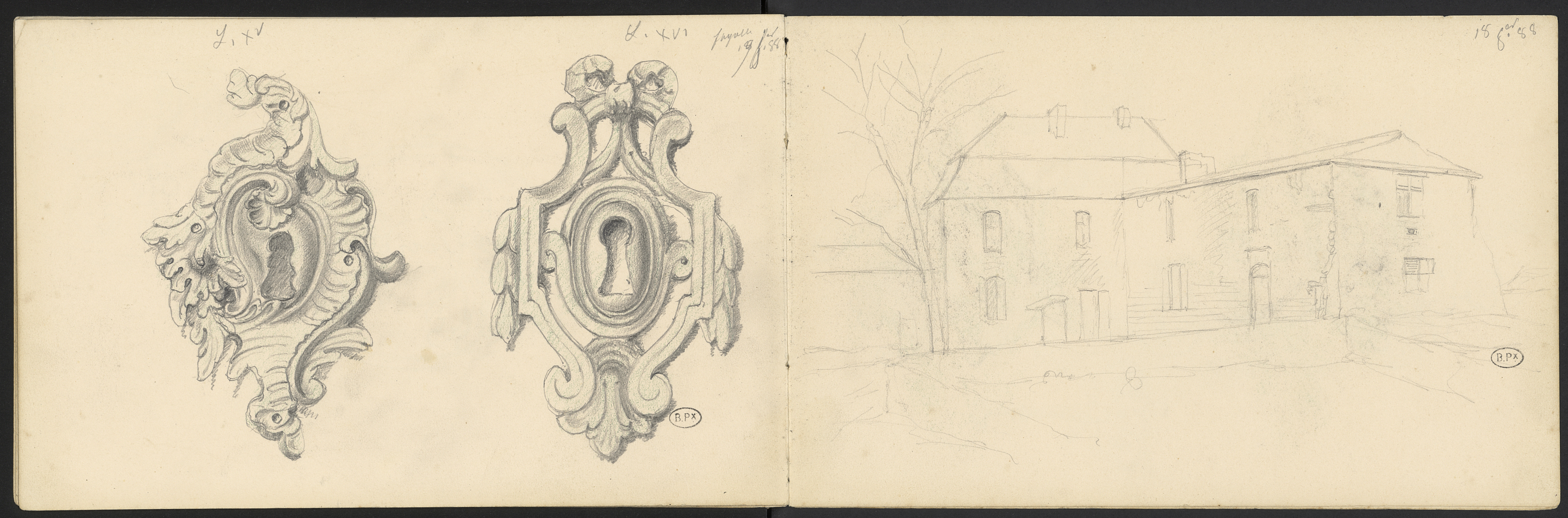 Page précédente, deux caches de serrures décorés Louis XV et Louis XVI [probablement château de ] Fayolle.