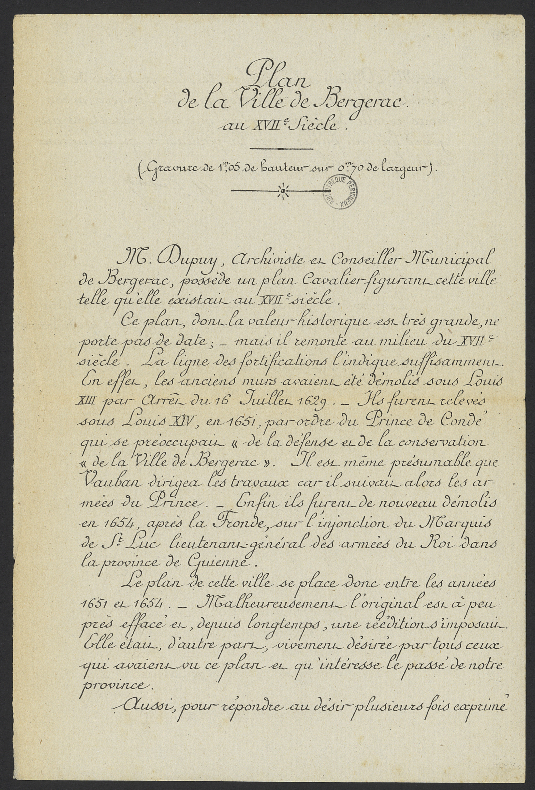 Bulletin de commande d'un plan de Périgueux, recto
