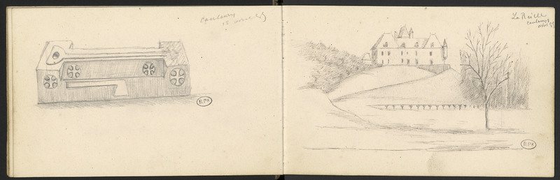 Page précédente, pierre tombale provenant de Coulaures, dessin daté du 12 avril 1885