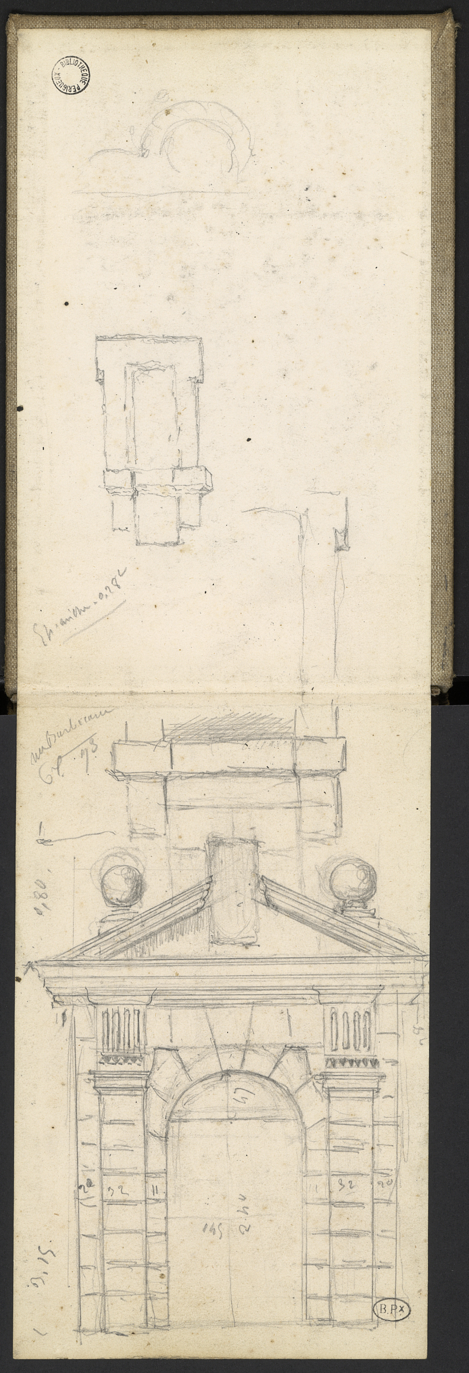 [Probablement esquisse avec mesures du portail de l'Hôtel de Fayolle à Périgueux 14 Rue Barbecane avant modifications et de son élévation à l'étage]