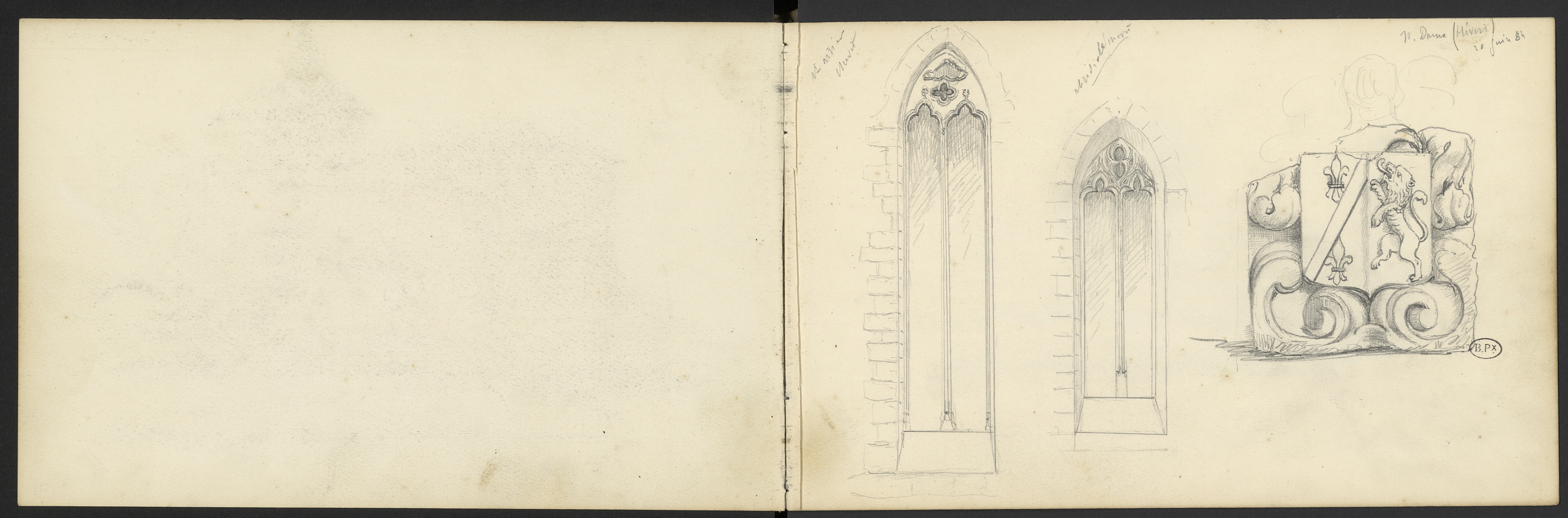 Armoiries :" parti de un [de sable] aux deux fleurs de lis en pal au demi chevron [d'or]" qui est de Lalis (?) , "partie de deux au lion léopardé morné [sic]". Encadrement de de rinceaux à volutes surmonté d'une esquisse d'un casque de chevalier.
