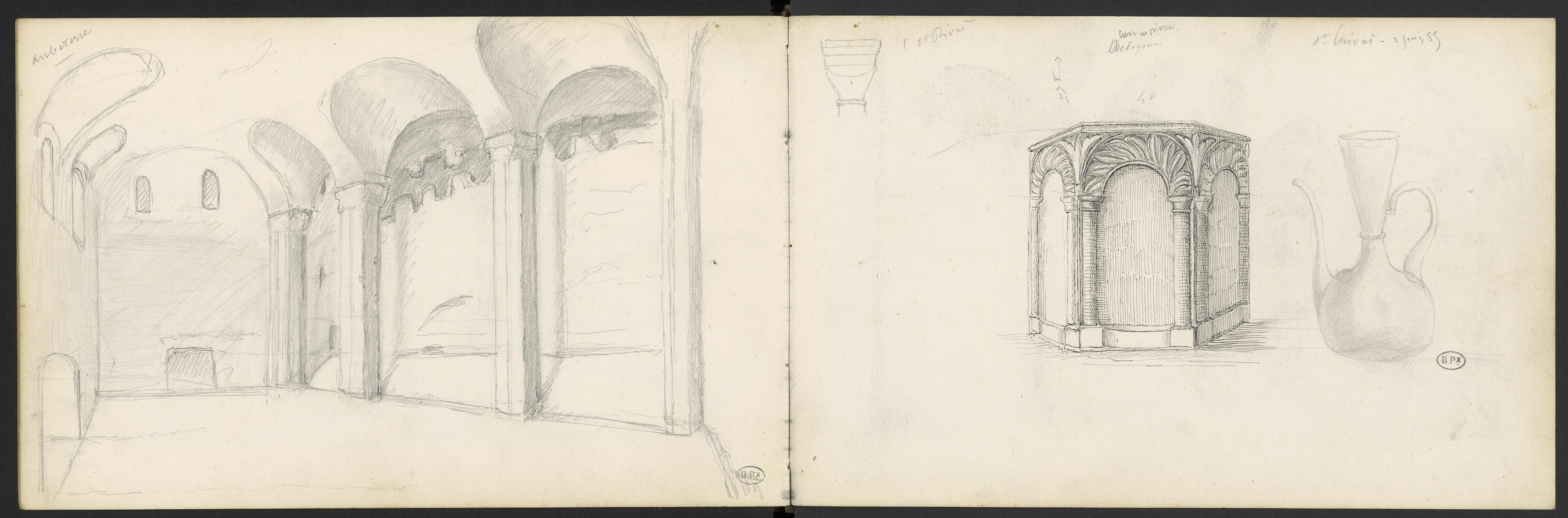 Divers dessins, dont une cuve octogonale signalée à St-Privat