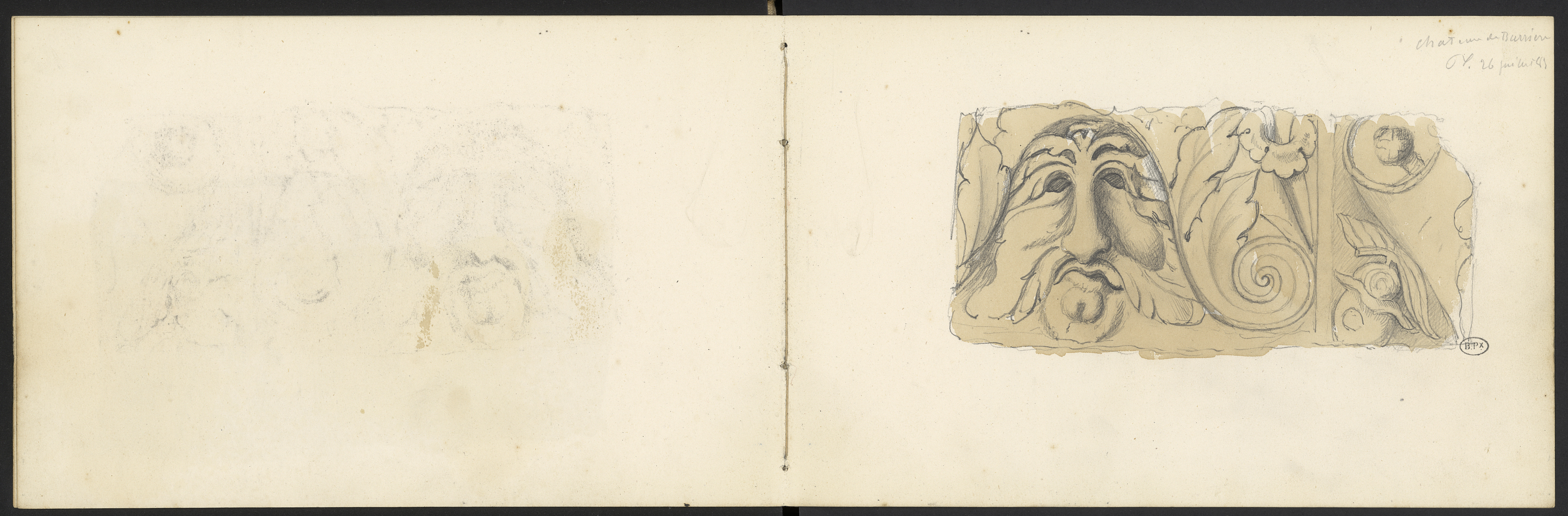 Sculpture gallo-romaine . Tête de faune dans les feuillages d'une frise (?)