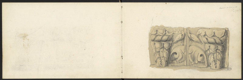 Sculpture gallo-romaine . Motif ornemental sculpté centré sur deux oiseaux posés sur des chapiteaux aux feuilles entrelacées.