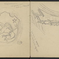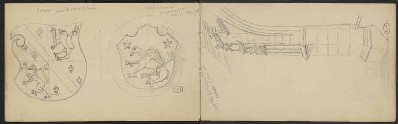 Armes sur clefs de voute : " Ecartelé au un et quatre trois fleurs de lis à la bande de...au deux et trois au lion rampant" sur écu festonné. " d'argent au griffon enrichi de deux étoiles d'or" sur écu festonné à la clef de voute du collège St-Michel de Cahors.