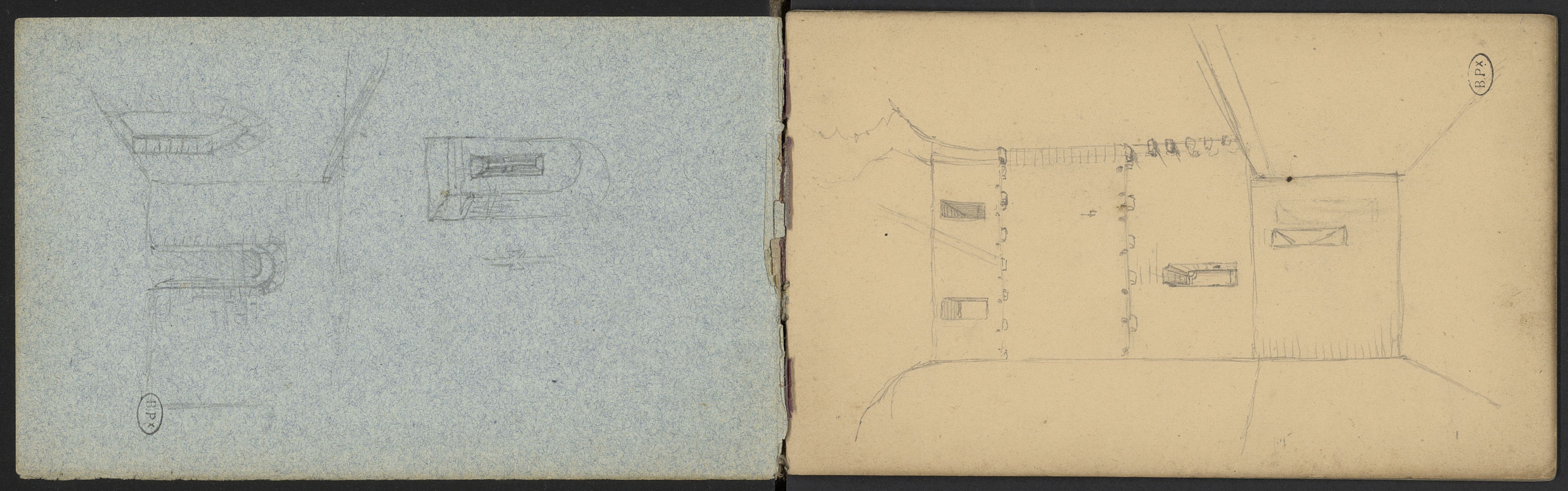 Page précédente, croquis d' archère à croisillon dans une niche et deux croquis de portes une à arcature brisée et l'autre en berceau à double rouleau.