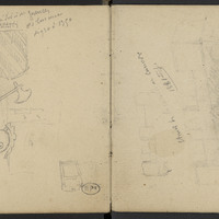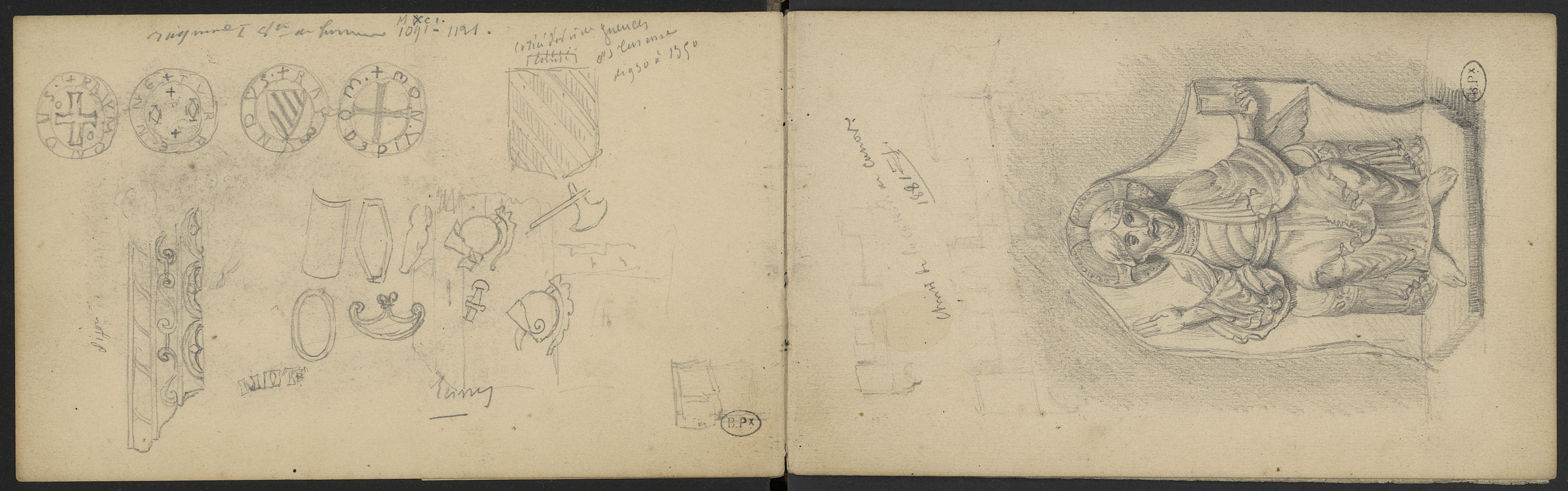 Divers croquis page précédente : Raymond Ier V(icom)te de Turenne (MXCA 1091-1101). Deux monnaies. " coticé d'or et de gueules de Ornements décoratifs douze pièces." qui est de Turenne. Couronne de Comte. Ornements militaires décoratifs. Frise décorative.