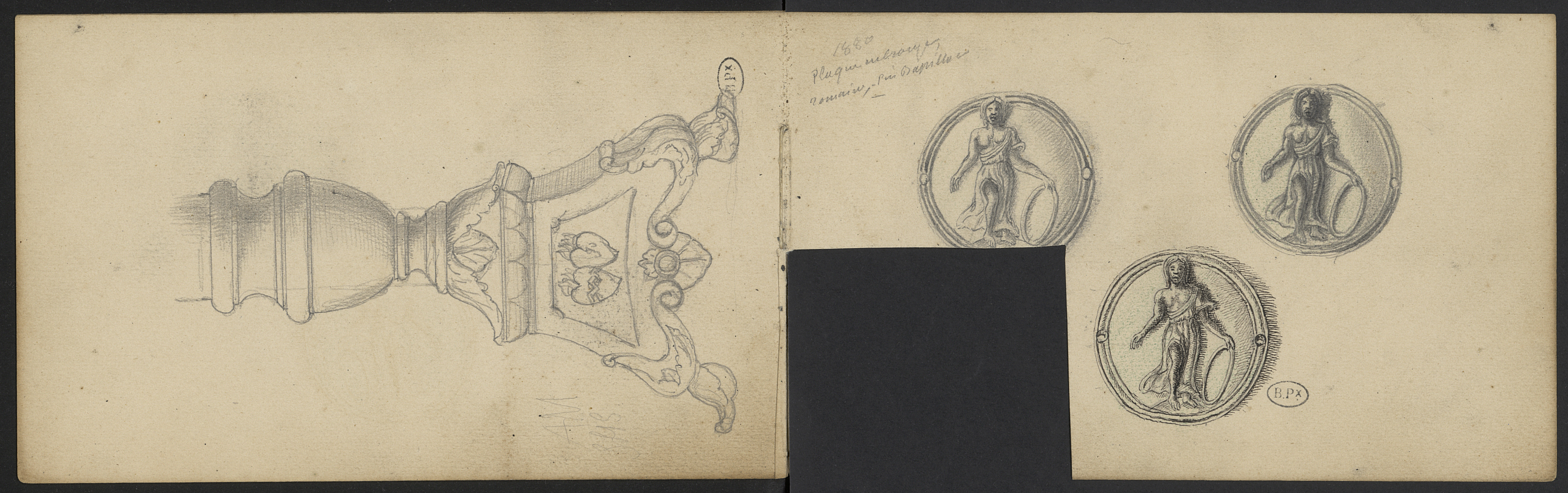 Plaques en bronze circulaires au décor de femme au cerceau, gallo-romaines