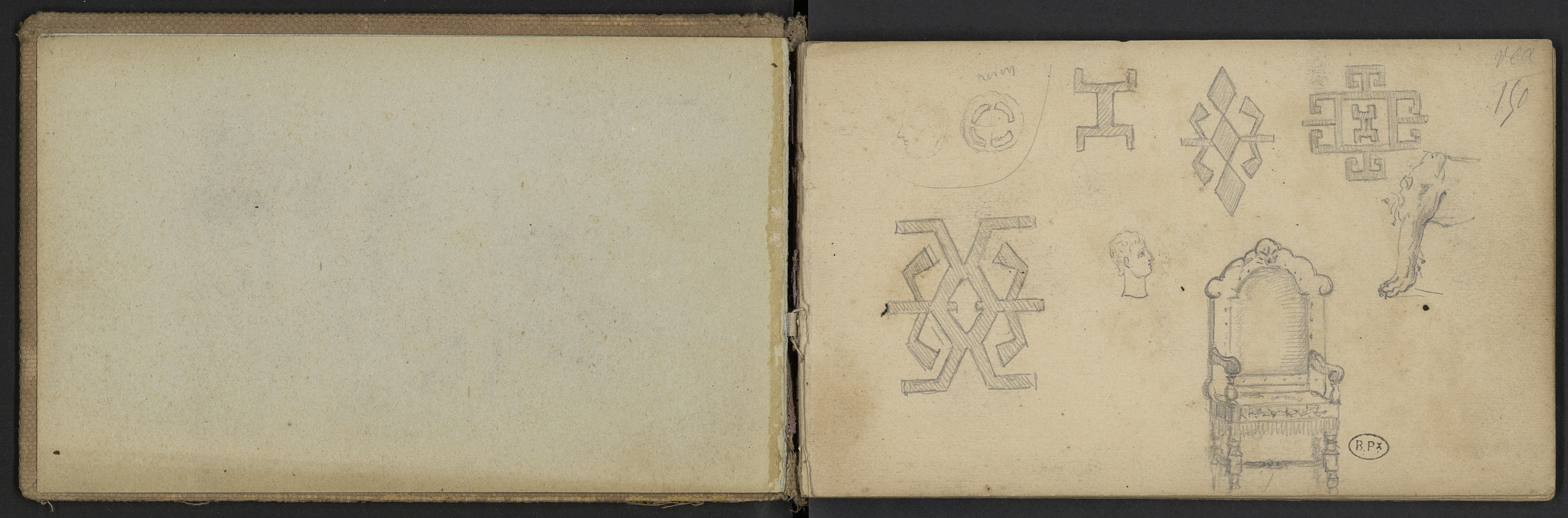 Divers croquis, fauteuil, formes géométriques, visage, monnaies.