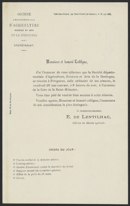 Invitation à une réunion de la Société d'Agriculture