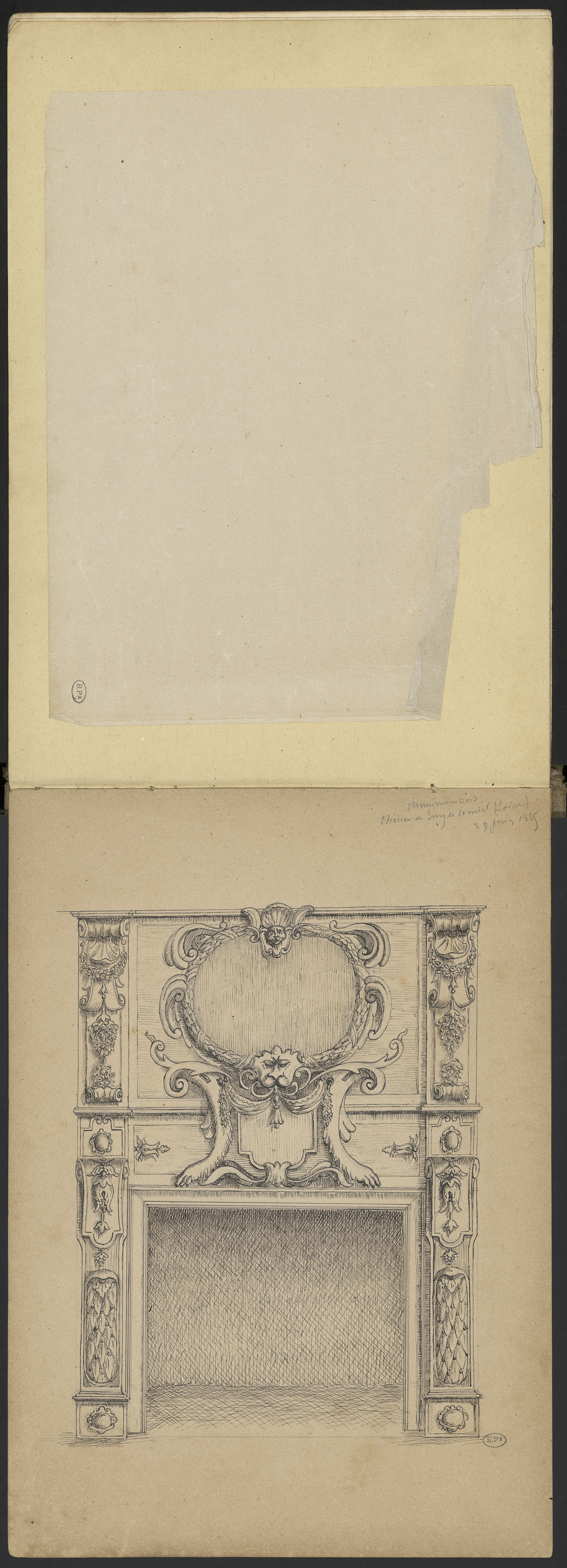 Au manteau de part et d'autre sur les pilastres des pendentifs floraux avec volutes sont introduits par des cabochons