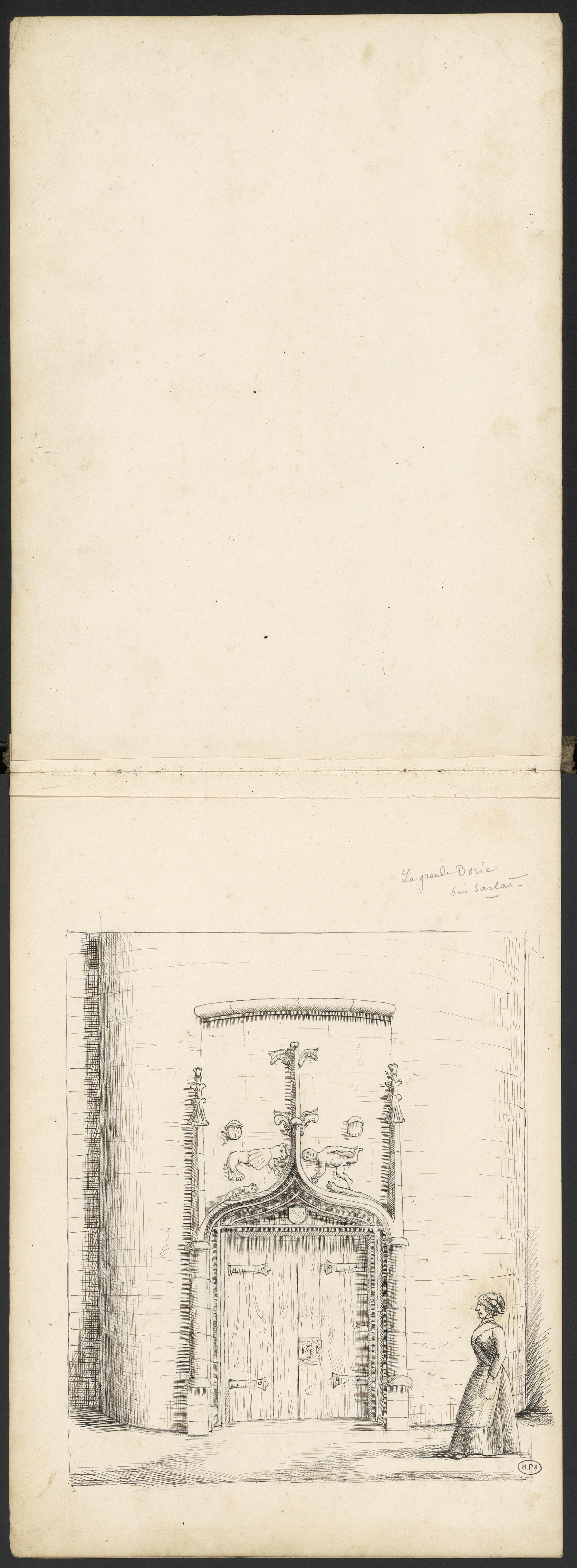 Illustration : Porte de style gothique flamboyant au lion et au jongleur à la balle aux deux coquilles St-Jacques et deux animaux rampants (peut-être des narvals)face à face.